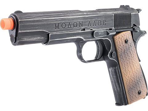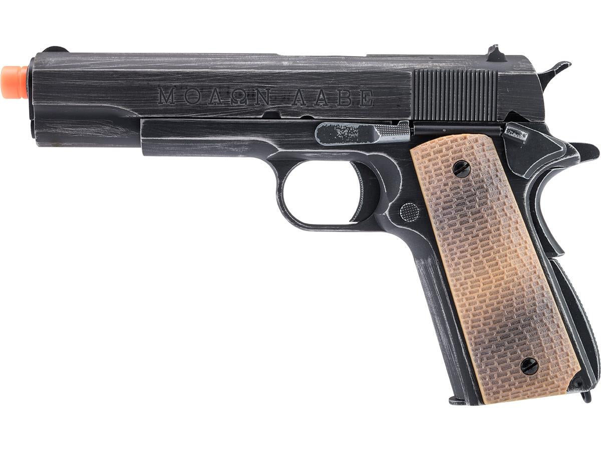 The Armorer Works "MOLON LABE" 1911A1 pays homage to the classic USGI sidearm. The replica pistol features a beautiful imitation patina finish and weathering to resemble the battle hardened appearance of a service weapon that has been through many battles. The classic expression of defiance and kill tallies are boldly carved into the slide to show surrender is not an option and taking this weapon will come at great cost.