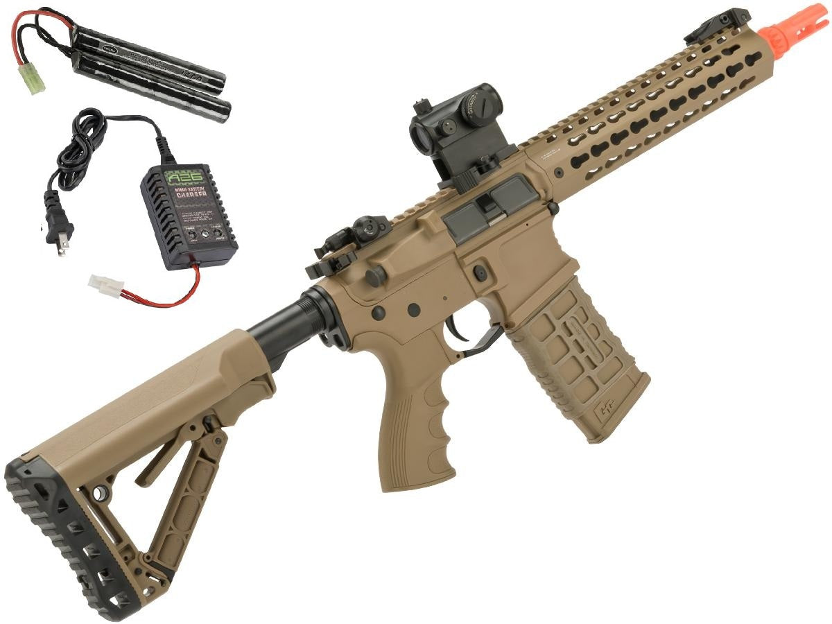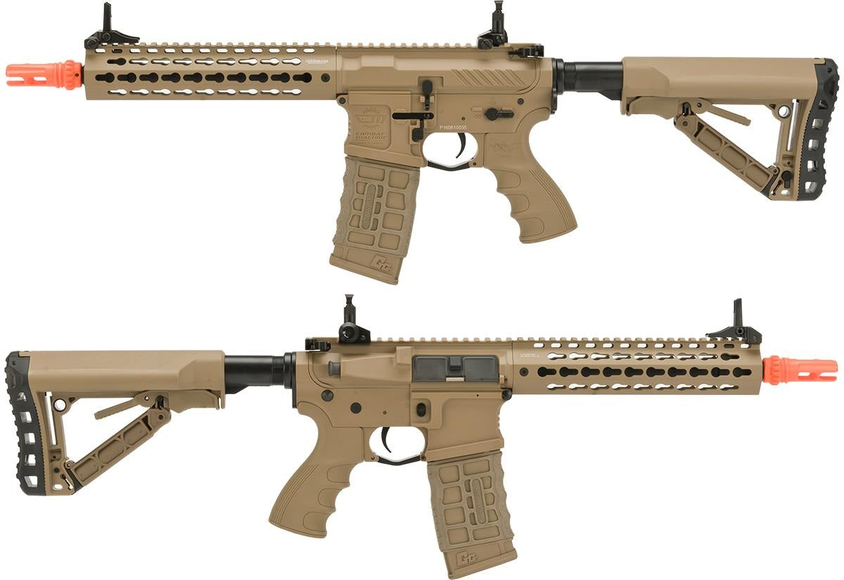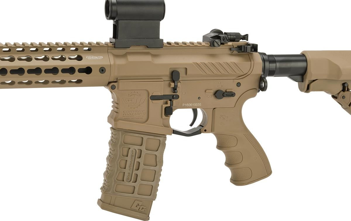 The newest evolution of the G&G Combat Machine line up takes all the standard features that everyone has come to know and respect from the Combat Machine line and improves upon it by offering upgrades and modifications that are never seen at such a low price point, and yet done to such a high level of quality. The CM16 SRXL offers an entirely redesigned polymer receiver, borrowing from the ever popular billet style that has been seen more and more in the firearms world. Other improvements include and ambidextrous magazine release, ambidextrous mock charging handle, metal keymod handguard and a selector switch with a heavy duty detent that gives the user tactile feedback when changing fire modes. While the CM16 SRXL knocks other AEGs in its price range out with its agressive styling, it's whats on the inside that counts most. Installed from the factory is a MOSFET, allowing the user to use LiPo batteries without worrying about damaging the gun and a programmable fire control which allows the shooter to choose either full-auto fire, or three round burst fire modes. Loaded with features and good looks the CM16 SRXL is an excellent choice for any airsofter who is in the market for a gun that has all of the latest features and technology.