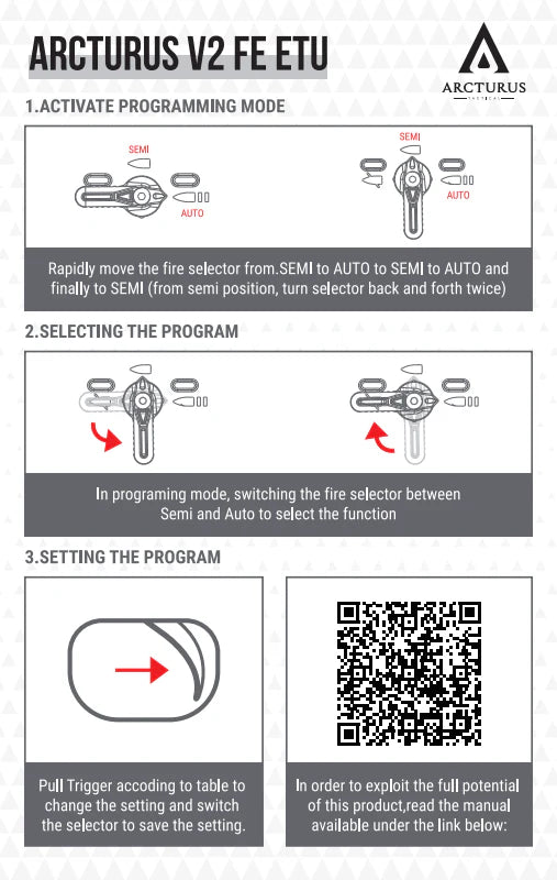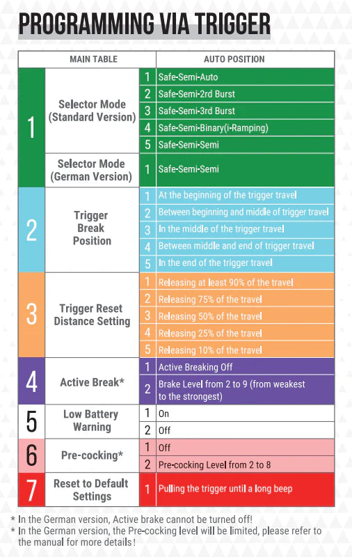 - Firing Mode: Semi Auto/ 2rd Burst (Programmable) / 3rd Burst (Programmable) / Binary (Programmable) / Full Auto / Safety