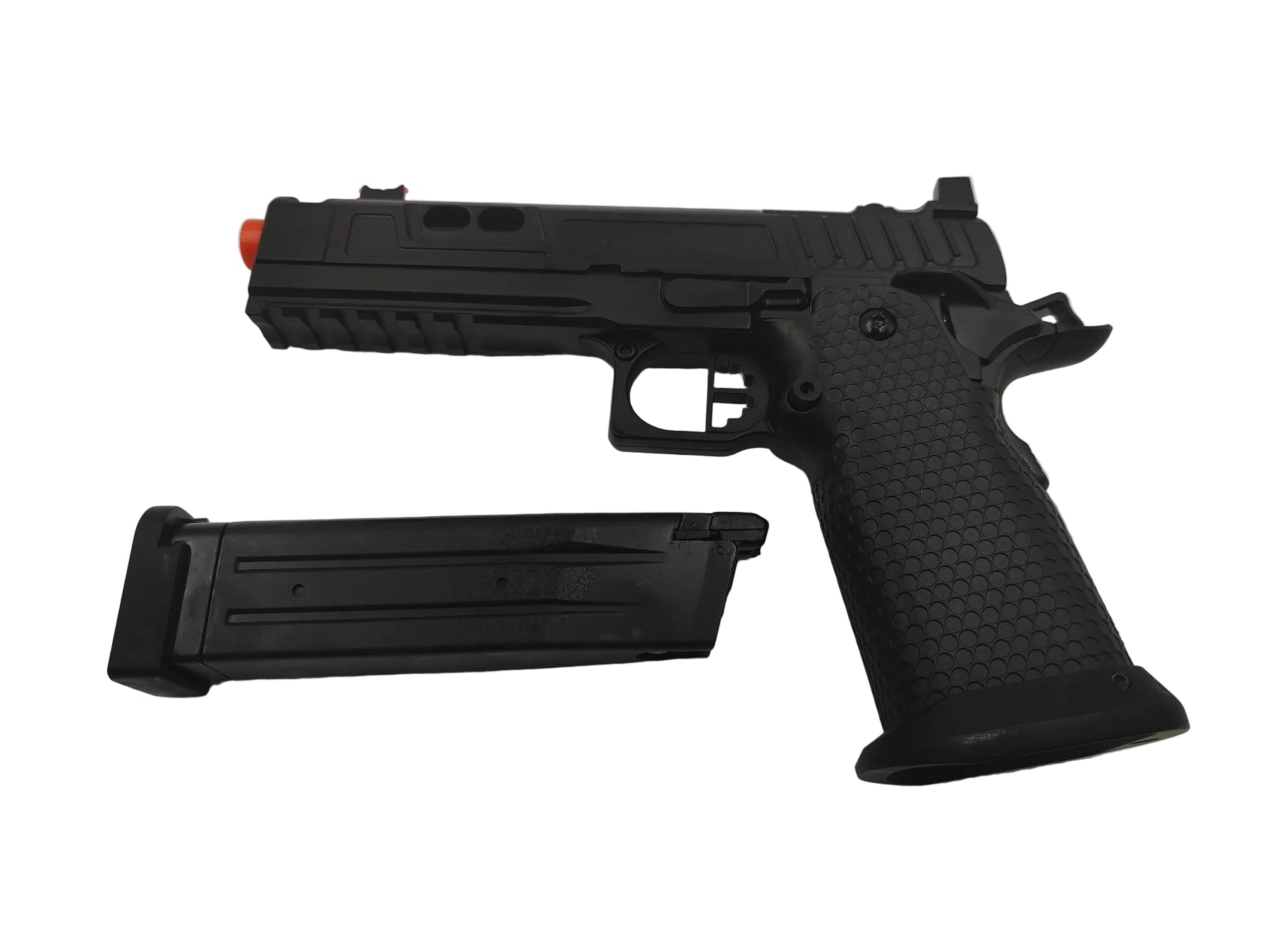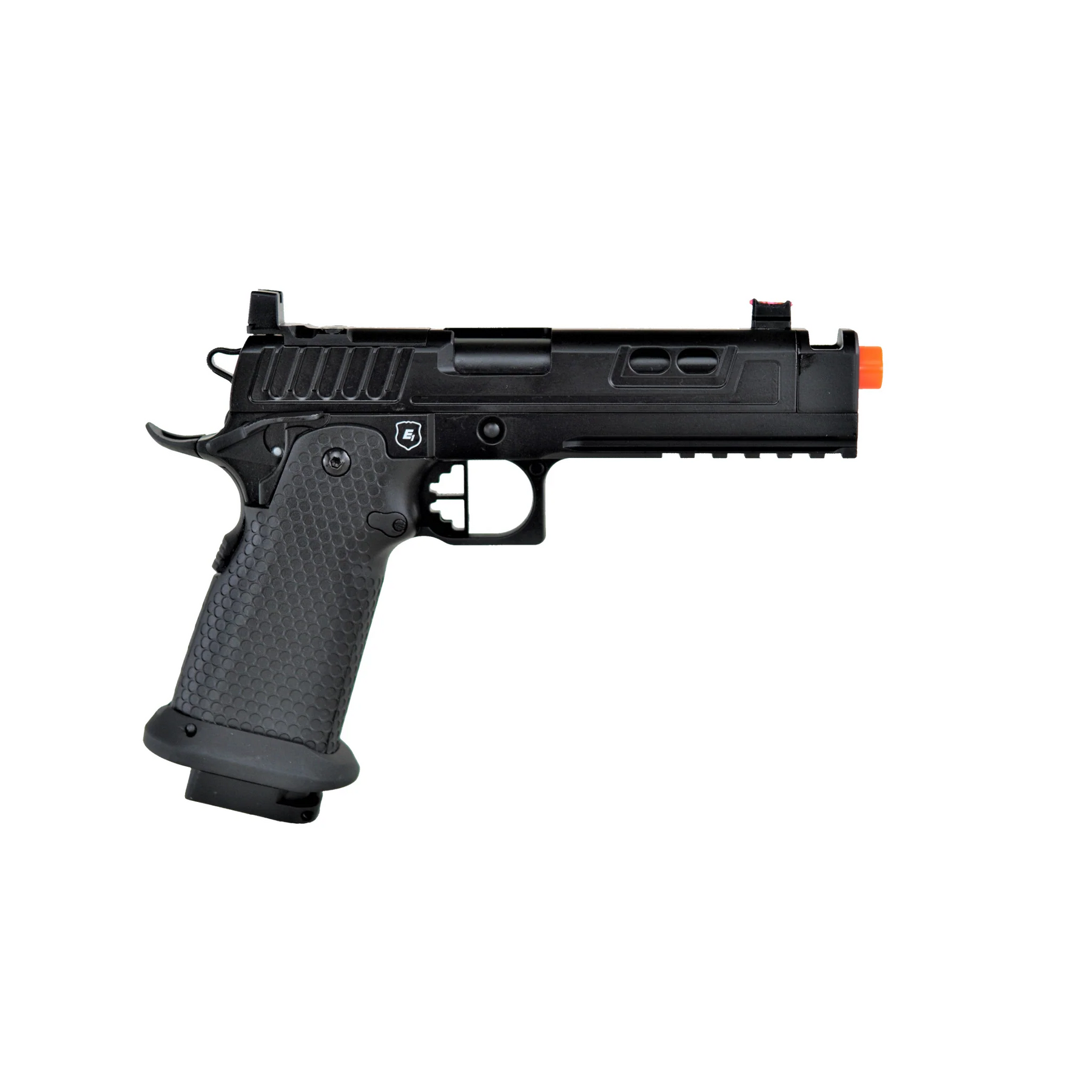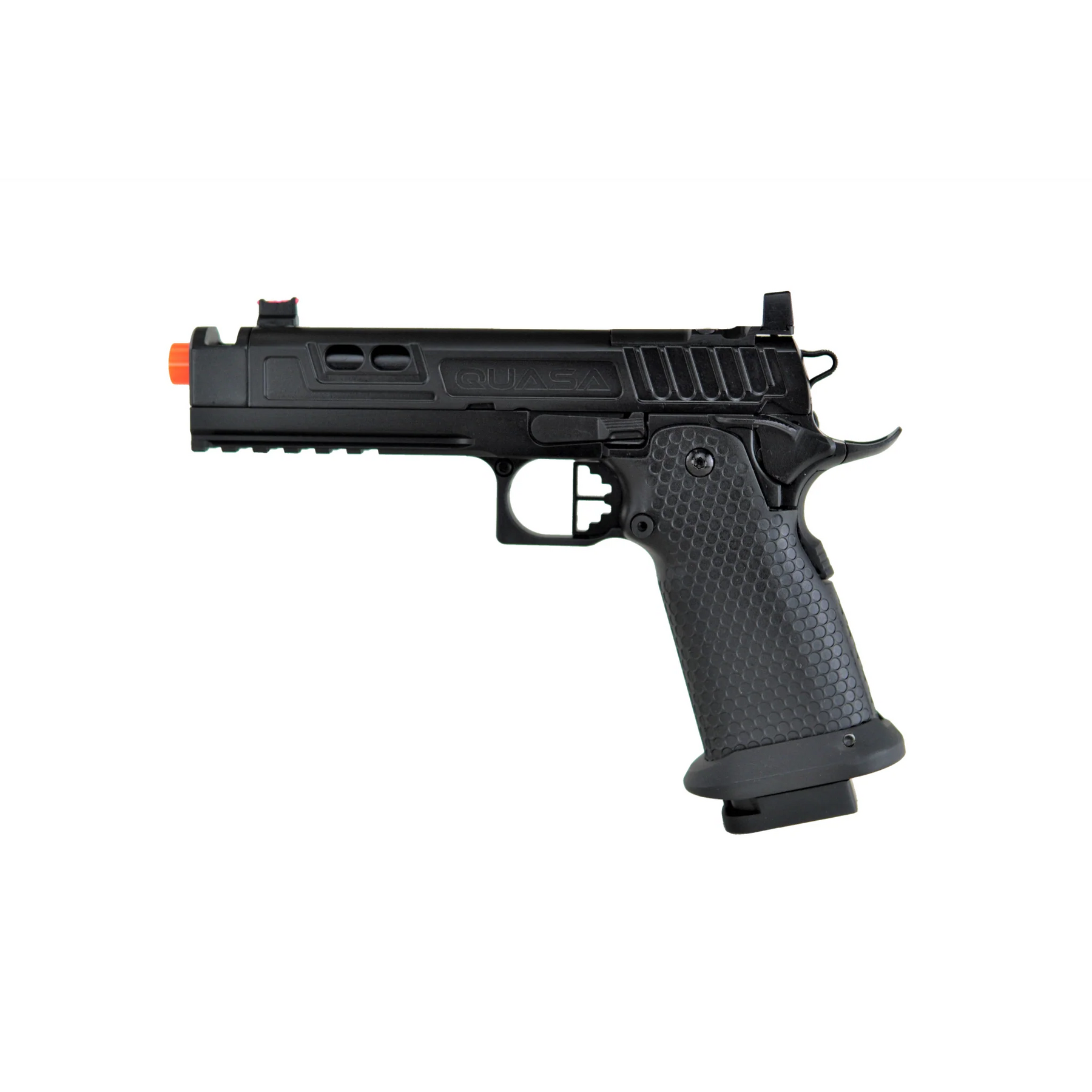 The Quasa by Echo1 is an enhanced 4.3 Hi Capa style pistol that features a monolithic look with an integral compensator and length-matched frame. The compensator is integral to the barrel which the front sight is mounted to. A typical slide would have the front sight mounted to it and move as you fire. To enhance sight acquisition, the Quasa mounts the sight to the barrel/compensator instead. As you fire, the slide will move and the front sight will stay stationary, giving you the fastest acquisition and give you an easier time finding your sight picture in rapid shooting.