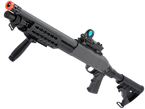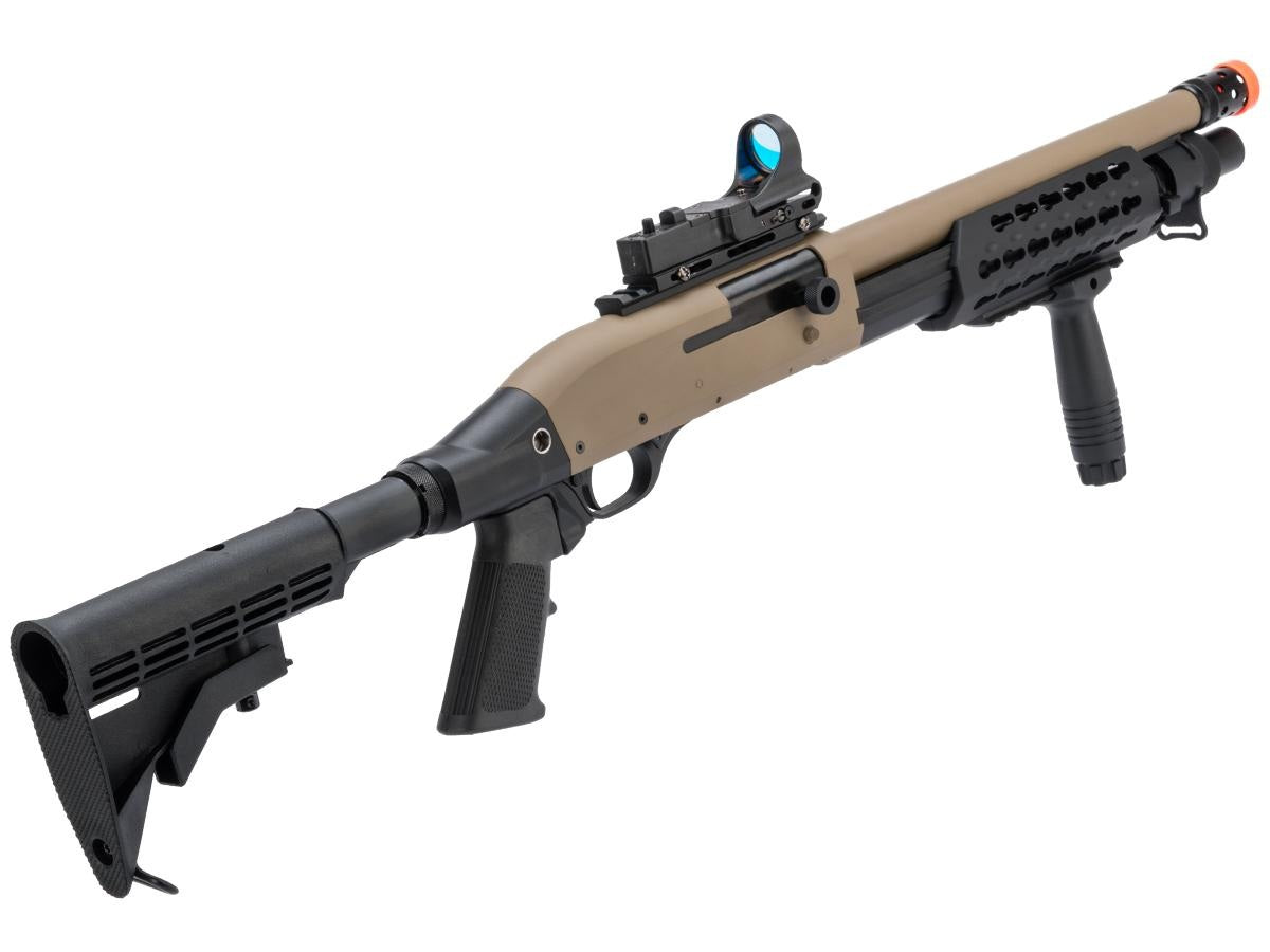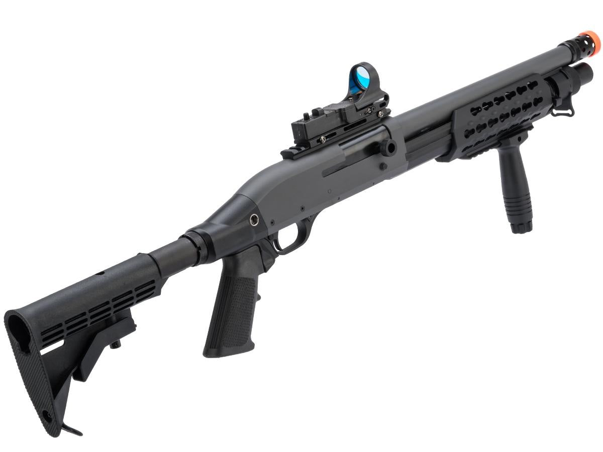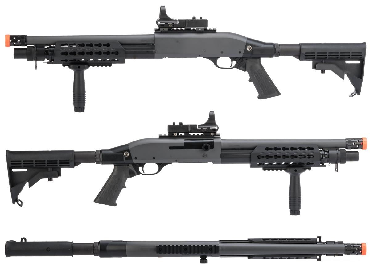 Redesigned from the Tokyo Marui M3 shotgun, the CYMA M3 is built to shoot harder for the performance driven American market! CYMA set out to capture this iconic shotgun in the form of a reinforced, reliable, powerful, and accurate Airsoft version. There is no reinventing the wheel here, the CYMA M3 series uses the tried and true tri-shot design but with beefier and more durable internals and the fine exterior appearance that CYMA is known for. Airsofters have been asking for it and CYMA has delivered, a skirmish grade tri-shot M3 Airsoft shotgun with a very attractive price tag. The CYMA 3-round burst shotgun is perfect for those looking for manual backup weapon. Remember to pick up some spare shotgun shells along with it!