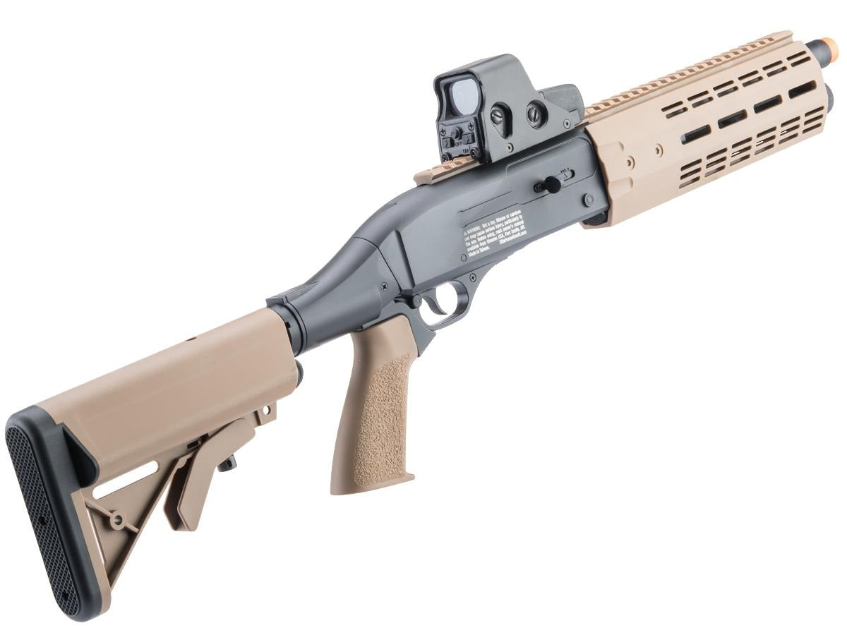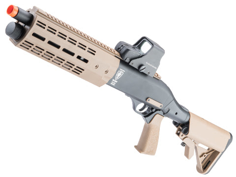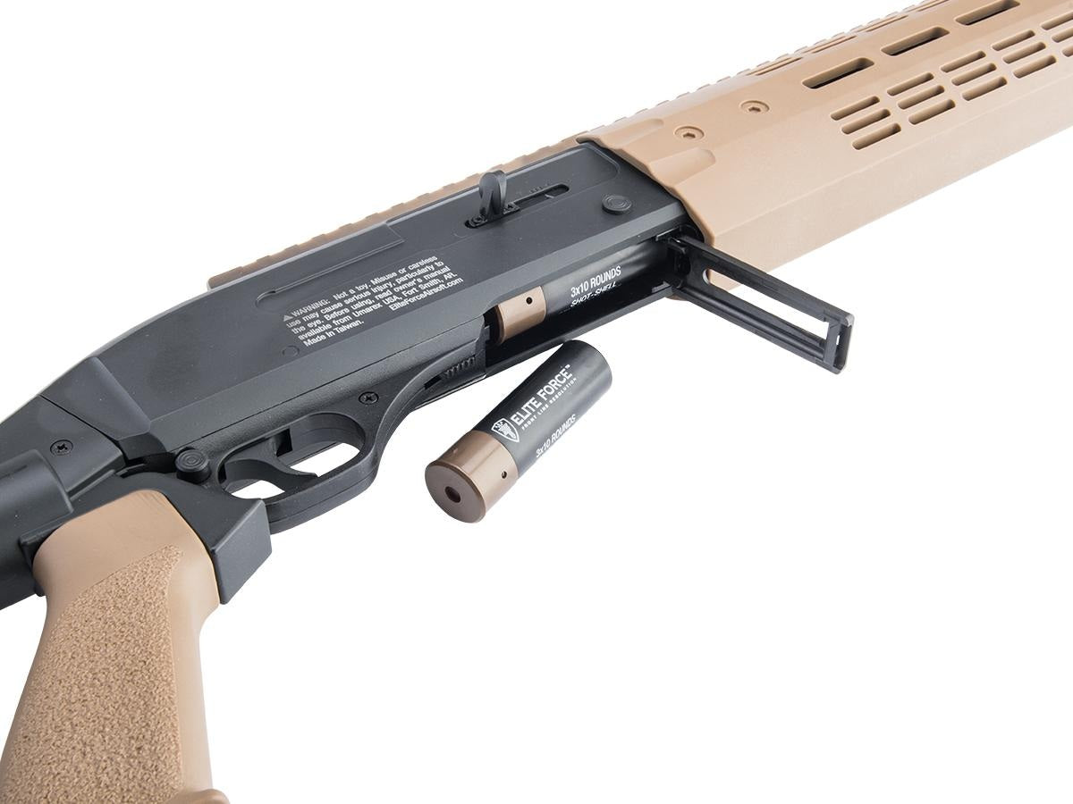 If you are looking for a new way to spice up your CQB game, check out the CO2 powered Elite Force Airsoft Tri-Shot 3-Round Burst Shotgun. This compact shotgun is powered by two 12 gram CO2 cartridges which are housed in the buffer tube. Expect .20 gram BBs to fly at 340 FPS and each shot shell holds 30 BBs for a total of ten shots of 3 BBs per shot shell. The Tri-Shot CO2 comes with 7 shots hells and a speed loader. you'll find a full length Picatinny rail on top with M-LOK slots on both sides and the bottom of the forend.