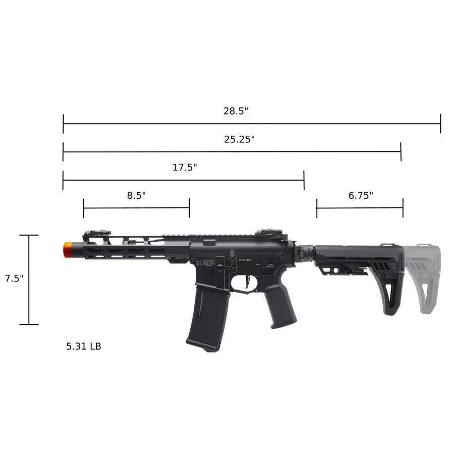 ARCTURUS X C.A.T. AR-15 Explorer 8.5" AR AEG contains a aluminum hanguard, receiver and comes with an adjustable 1913 PICATINNY FOLDABLE MODULAR STOCK. The handguard features a M-LOK rail with picatinny mounting system for easy mounting of accessories. The AEG has a ultra-compact size in-line DEANS 11.1v LIPO READY MOSFET with a 24k High Performance Motor w/ MIM Steel Pinion Gear for quick trigger response. Containing a split style gearbox for easy access and tunning. The gearbox comes with a mechanical PRE-COCKING sector gear for adjustments.