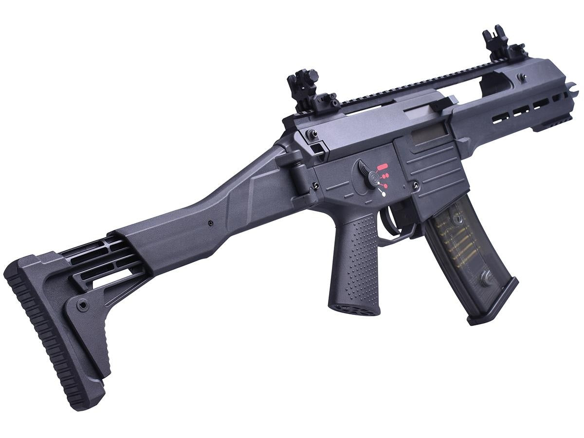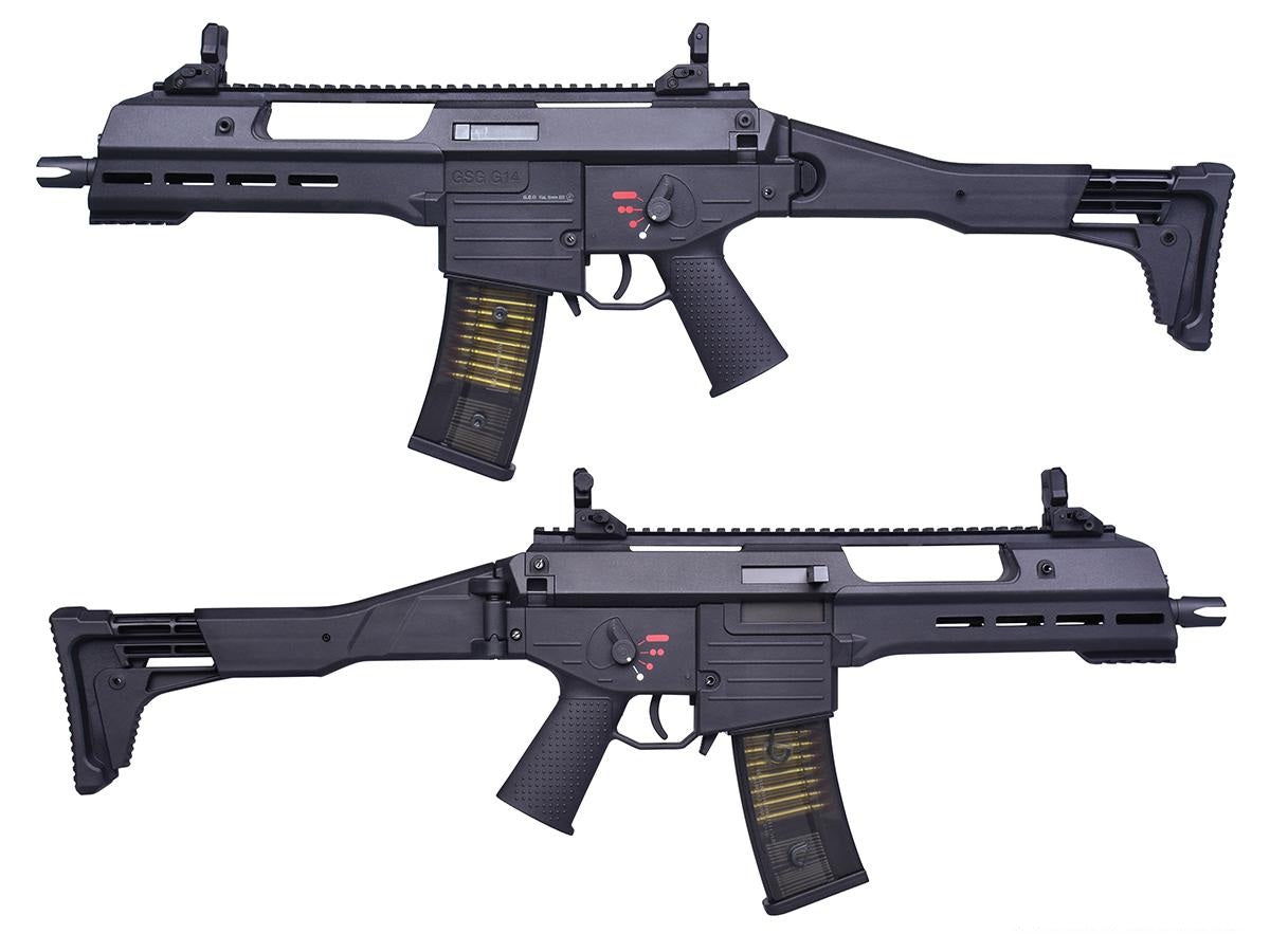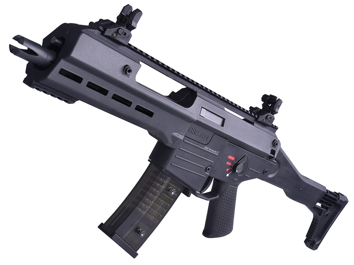 The GSG G14 is among the most technological advanced AEG rifle on the market with cutting edge internal and external features. The GSG G14 AEG features a realistic electric blowback system to simulate recoil. Additional features include an Electronic Fire Control System which helps cut down on jams / gear lock by cutting power to the gearbox when a battery approaches low voltage levels. Other features includes a 7 position retractable stock, integrated carrying handle, ambidextrous selectors, flip-up sights, functional bolt catch, integrated heat sink, quick change spring gearbox, easy take down, mock silencer / tracer unit ready, scope ready, attachments ready and much more!