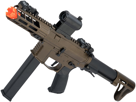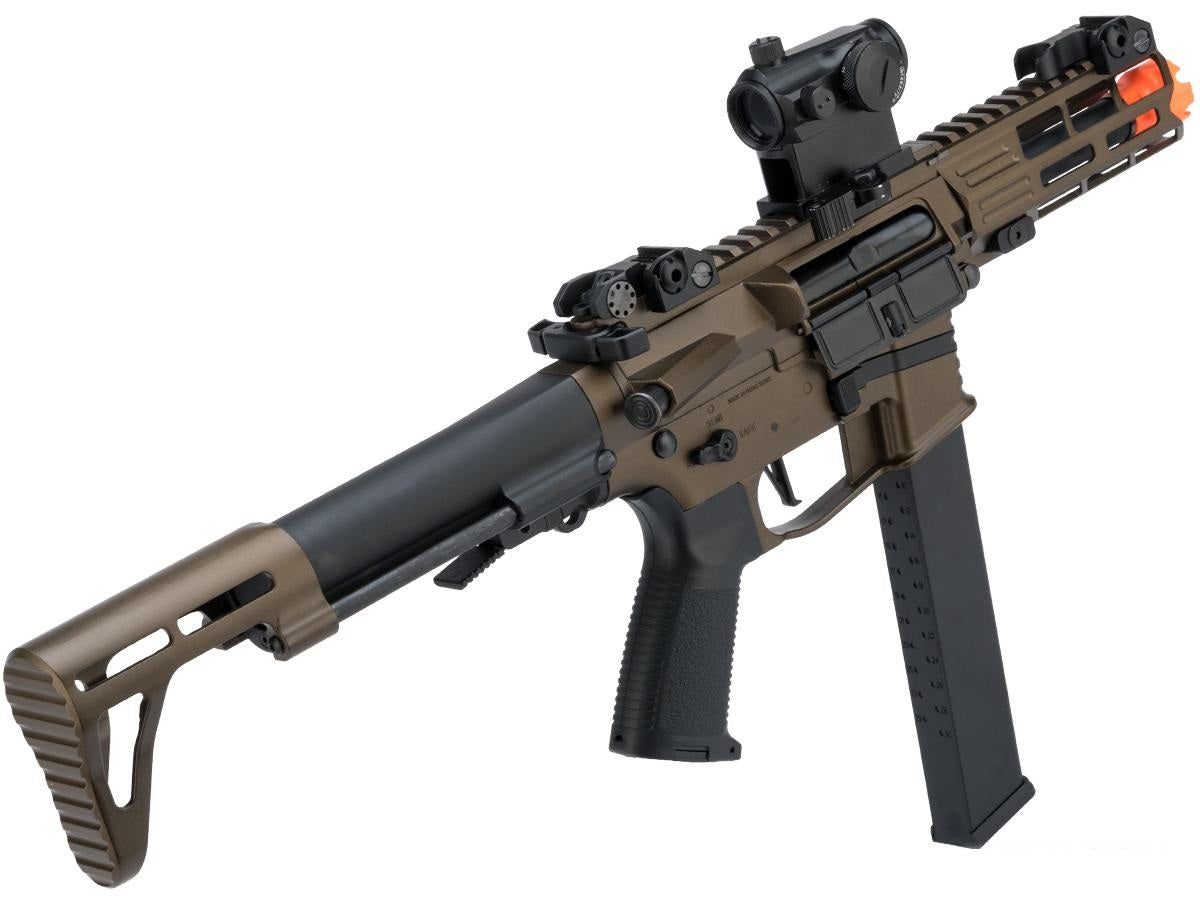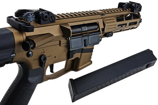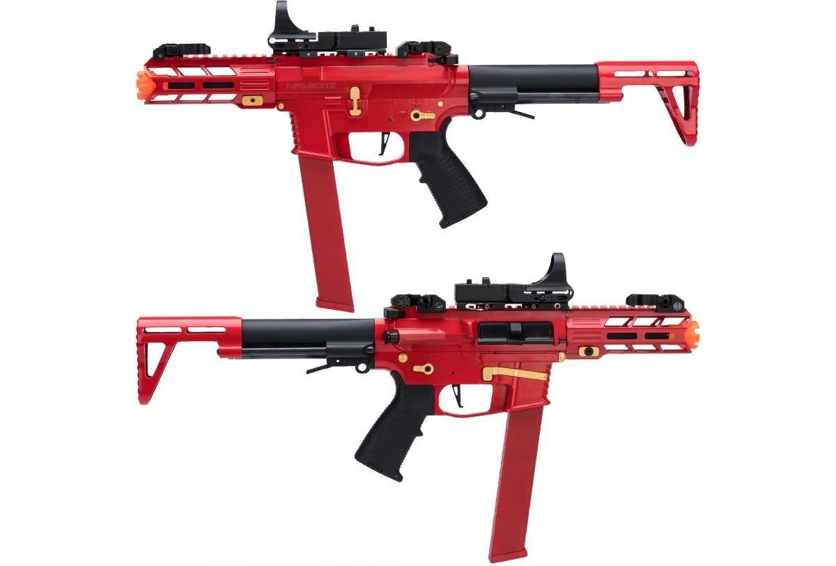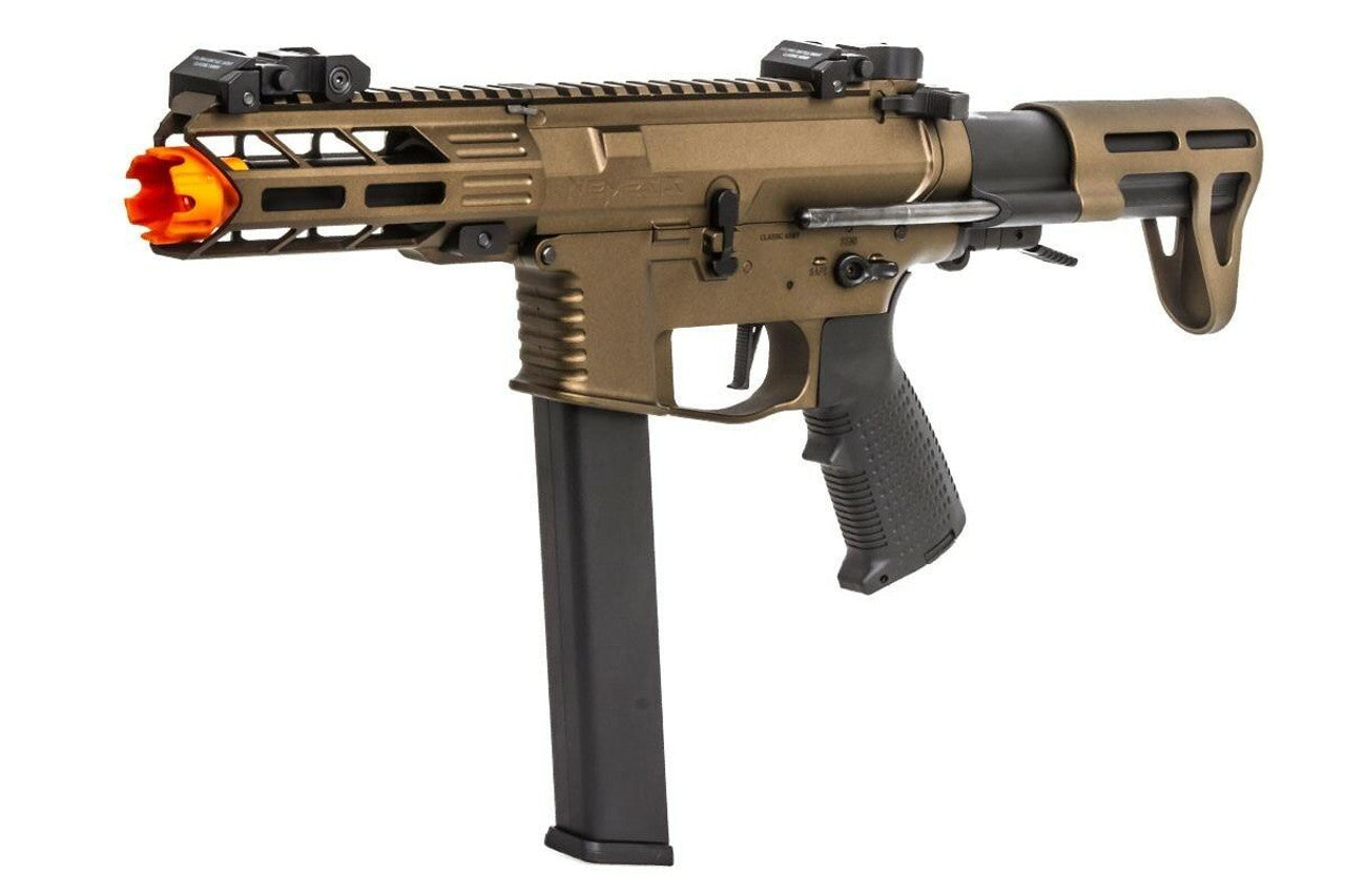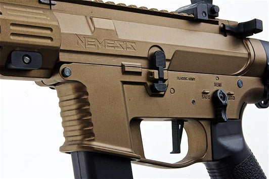 The Nemesis X9 is Classic Army's entry into the 9mm AR Machine Pistol segment in Airsoft. It's the first on the market to feature a full metal receiver, CNC machined out of aluminum, done up in a very aggressive machined billet styling. This compact firecracker is a great main gun, or even a sidearm in close quarters situations, both indoor and outdoor.