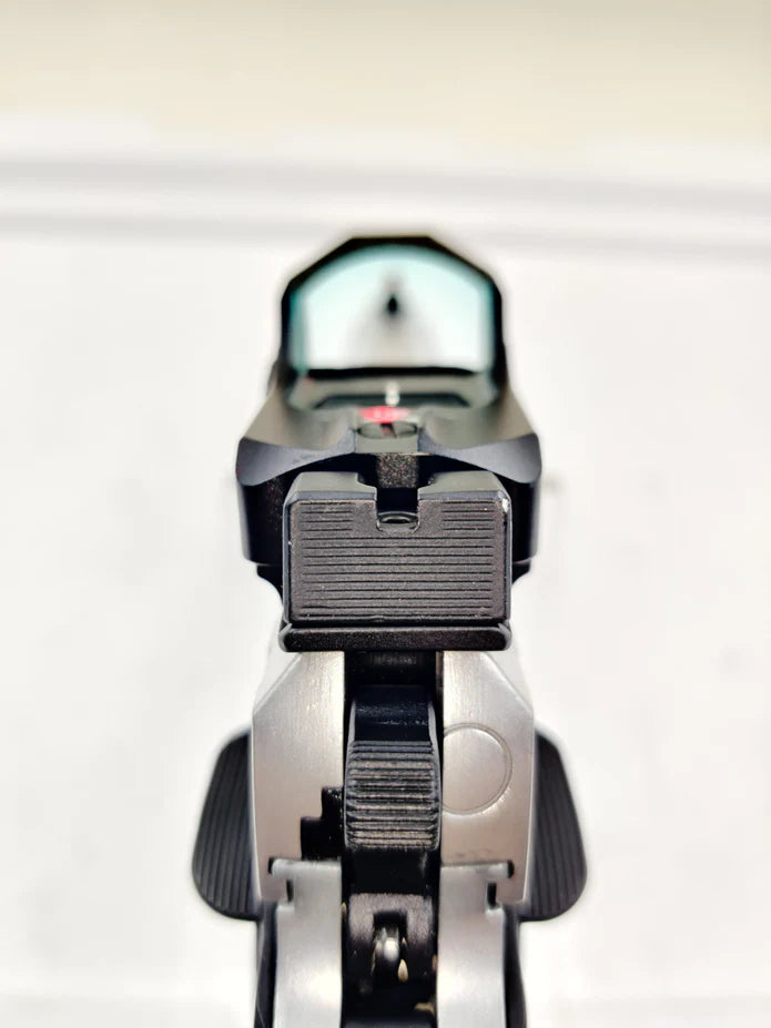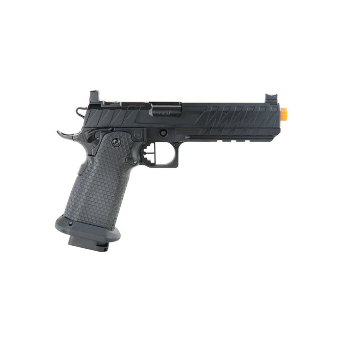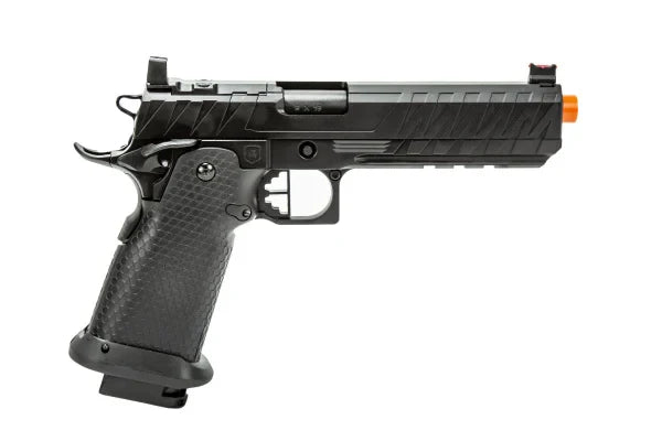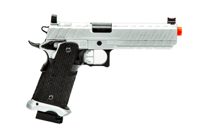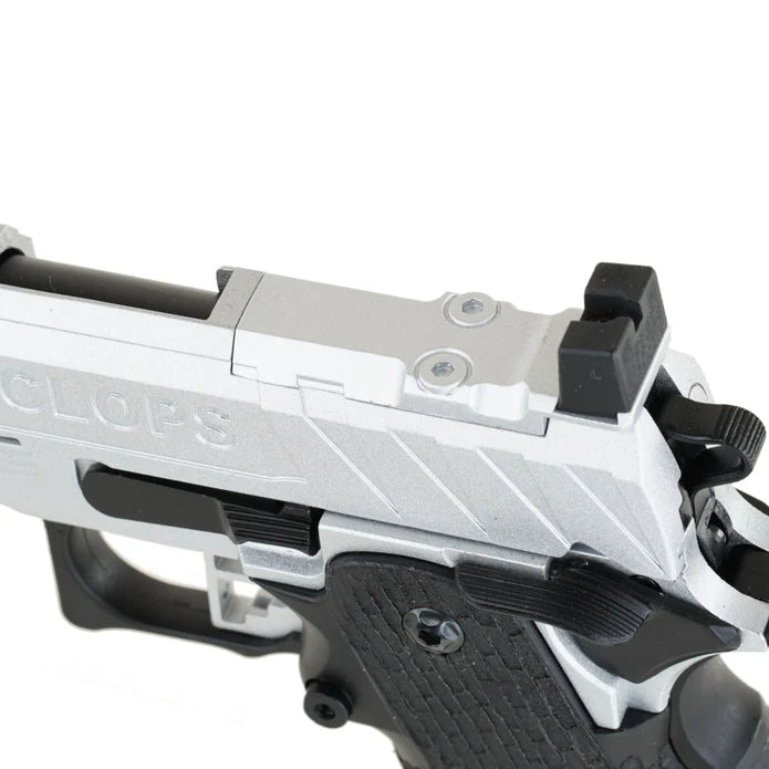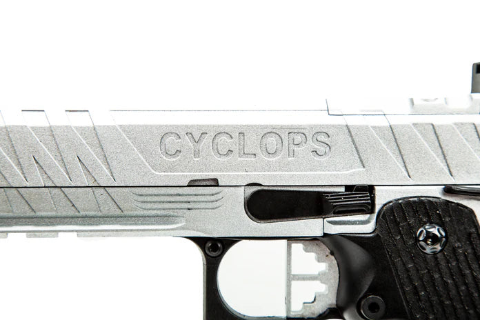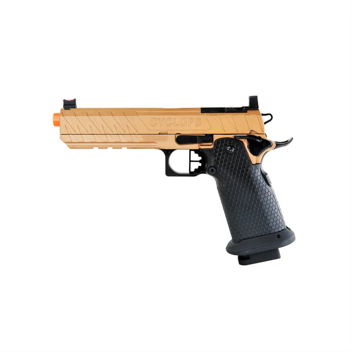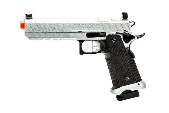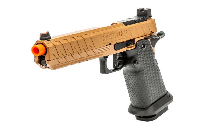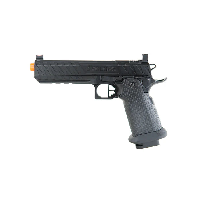 The Cyclops by Echo1 is based on the popular Hi Capa platform and is fully compatible with all internal upgrades you can throw at it. It has a 5.4" outer barrel which gives a little more velocity. The slide is cut to accept an optional optic mounting plate so you can install a Bravo Combat Dot. The gun features a modified non-tilting barrel system so the blowback is smooth even if you mount a tracer or mock suppressor.