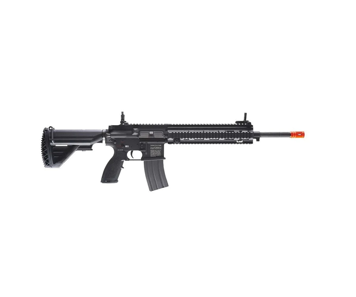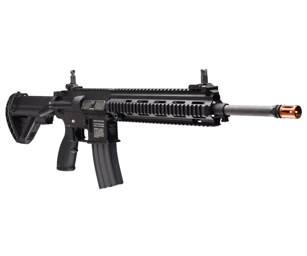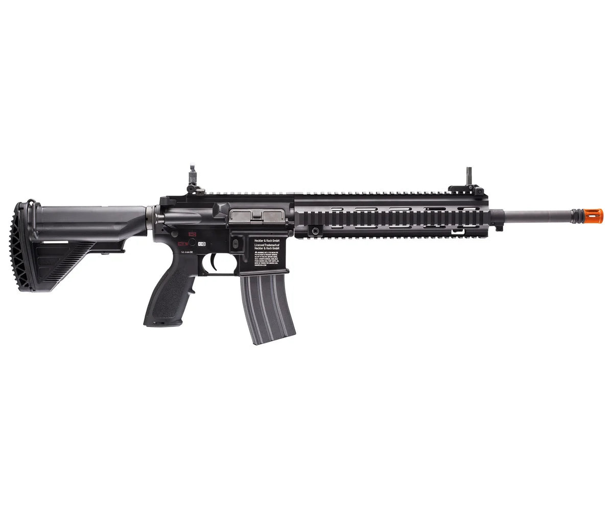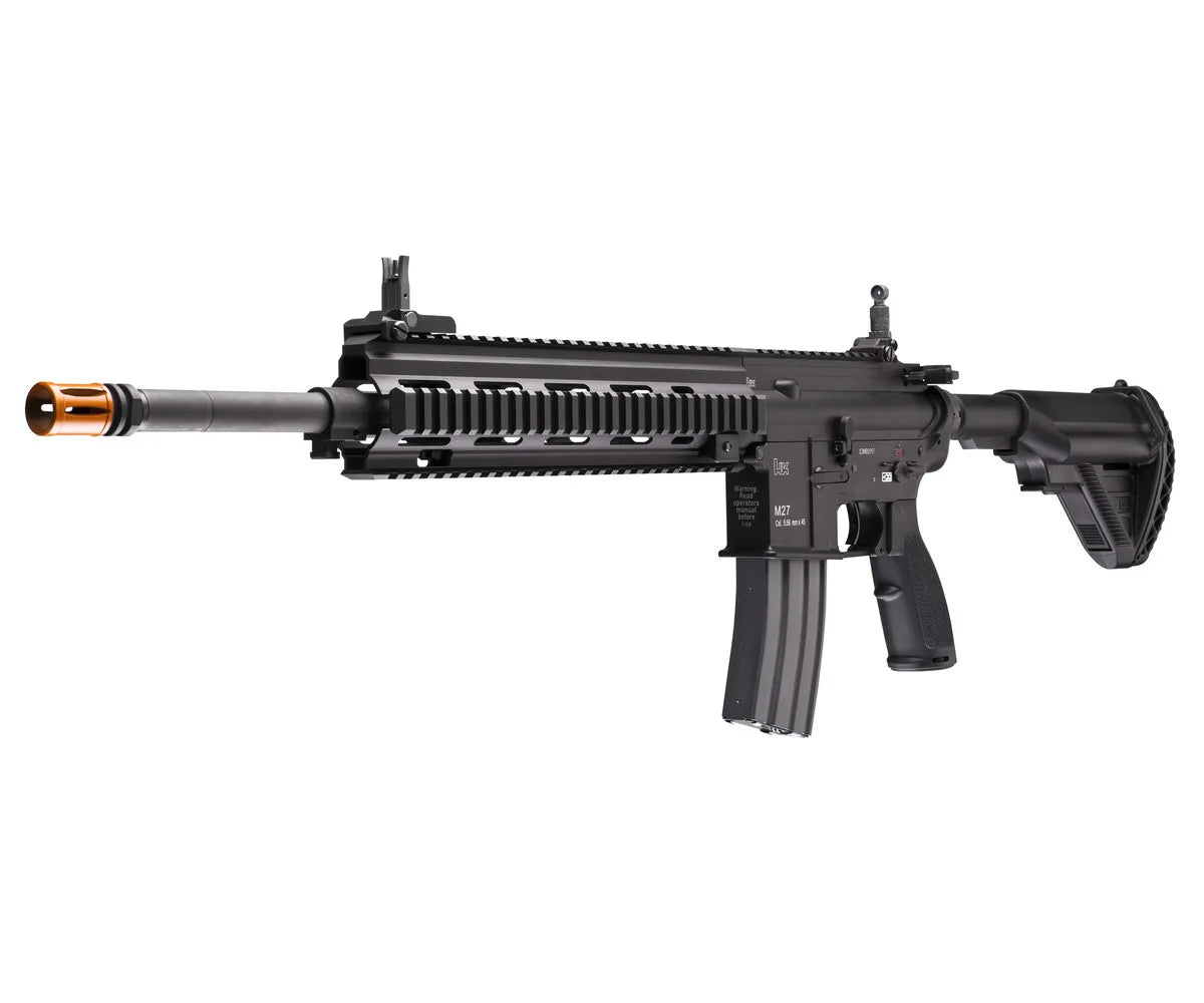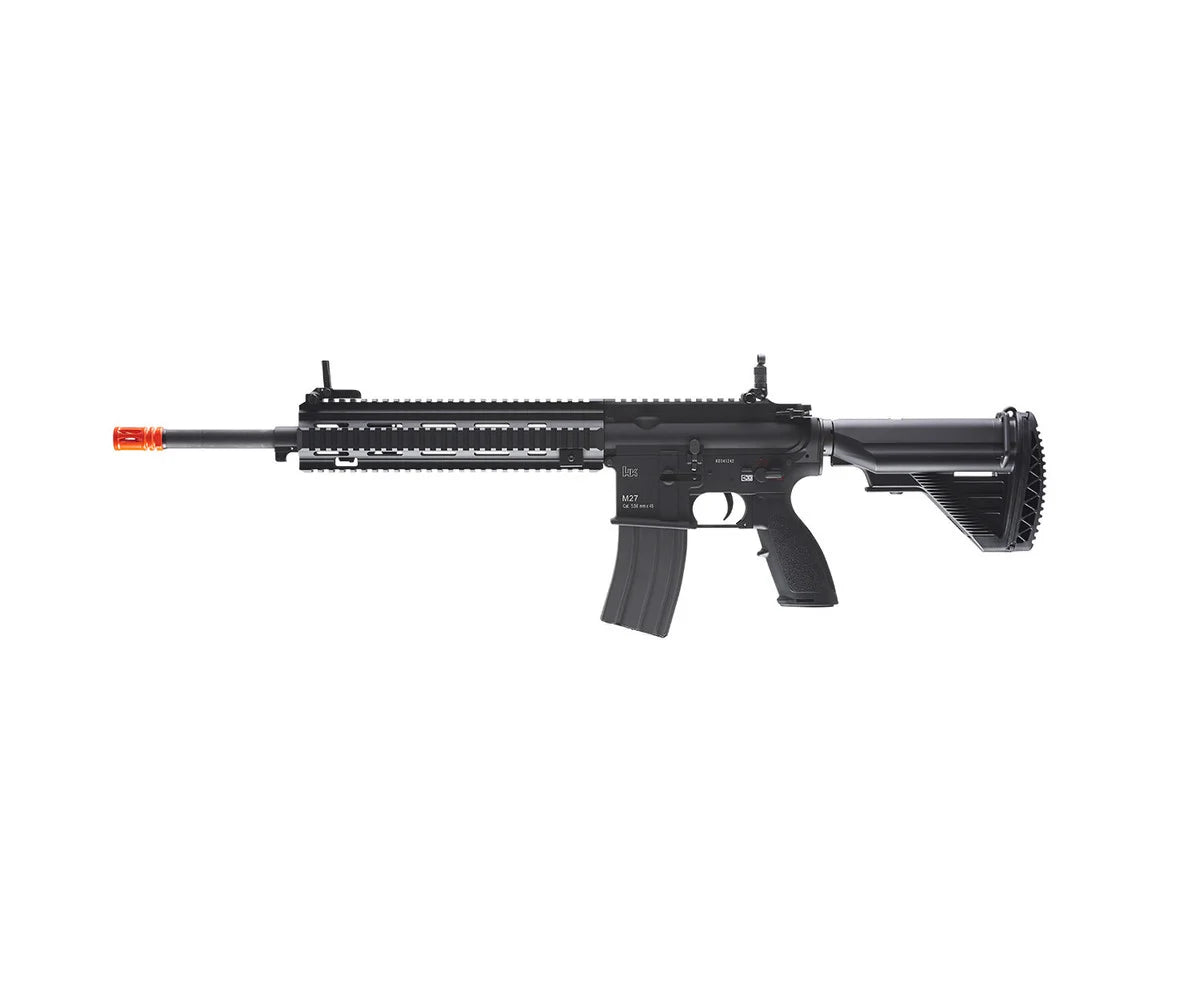 HK M27 IAR M4 AEG made by VFC is a fully licensed Heckler & Koch airsoft fun made by the team at Umarex USA. This new version features an upgraded Avalon ECS gearbox. This is a top-of-the-line and advanced AEG with full metal construction, accepts standard M4/AR15 style airsoft magazines, retractable stock with easy access to the battery compartment, and front and reat flip-up iron sights.