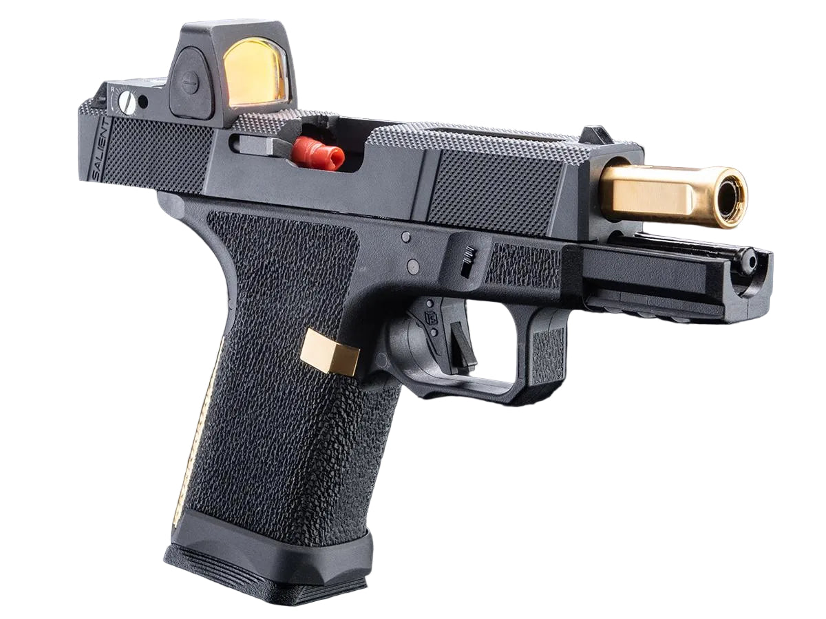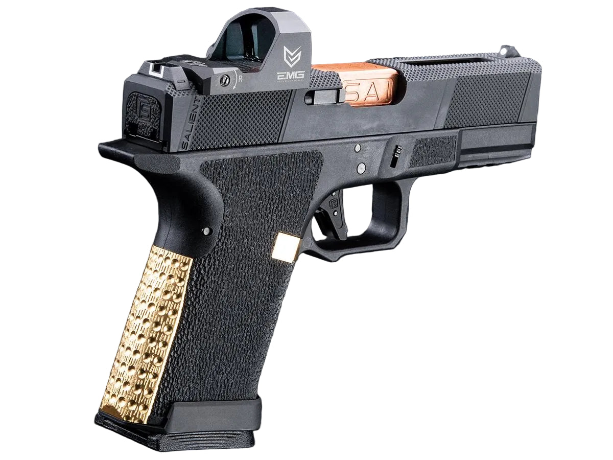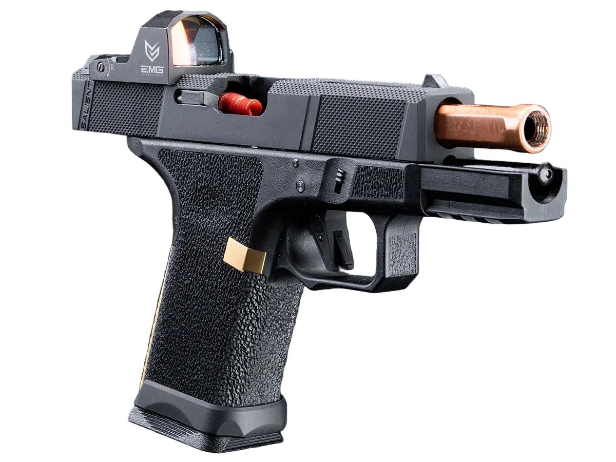 EMG has furthered their collaboration with Salient Arms International with a new pistol as the platform. Designed closely with the geniuses at SAI, the EMG / SAI Tier One Utility Package is designed to be as close to the real thing as possible offering shooters and enthusiasts the most realistic training analog available. Using the popular EMG Salient Arms International BLU Compact as the base, the Tier One Utility Package Pistol features a machined aluminum slide with hyper-aggressive front, rear, and top knurling to greatly improve grip no matter the situation. The Titanium Nitride styled box fluted barrel from Salient Arms comes standard with this pistol. Authentic rollmarks and branding top off the look, making it almost impossible to differentiate the 6mm version, from the 9mm version.