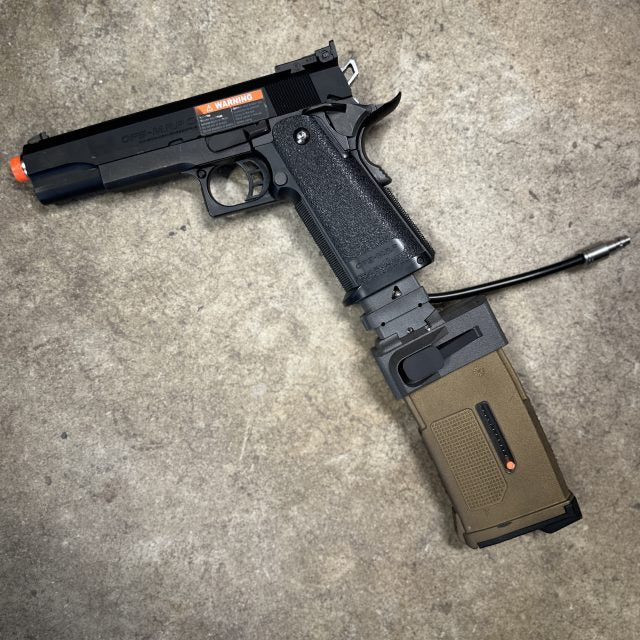 The Hi-Capa platform is one of the most widely used and customizable airsoft pistols, known for its exceptional performance and versatility. The TAPP Hi-Capa M4 Adapter enhances this popular platform by enabling the use of M4 AEG magazines, significantly increasing your magazine capacity and improving reload efficiency. Designed and built in the USA, this pre-built, plug-and-play adapter ensures your Hi-Capa is always ready for action, seamlessly integrating with M4 magazines to deliver consistent and reliable performance.