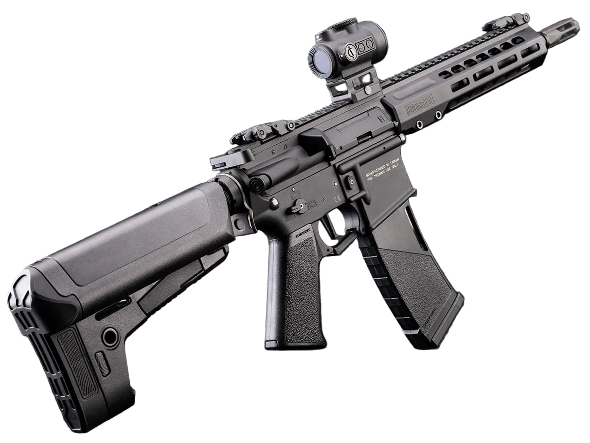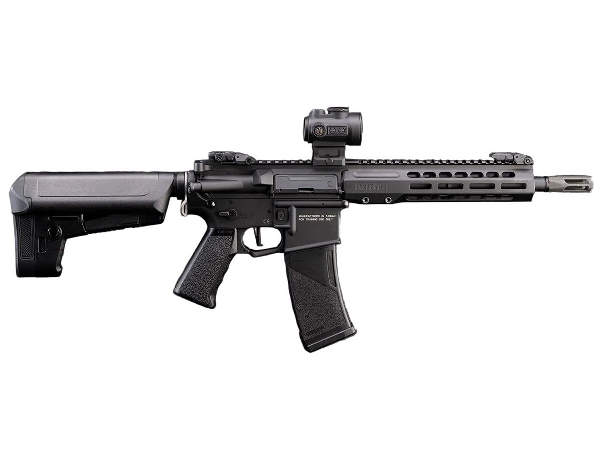The KRYTAC MK3 REC7 SBR is a short barrel rifle sporting fully licensed Barrett trademarks, enhanced ergonomics and upgraded internal components. It features the updated KRYTAC Nautilus mechbox with 8mm high performance bearings and a ported full metal rack piston, complemented by an integrated enhanced FET system offering faster trigger response, partial active braking, low battery detection, and gear strip protection. The MK3 REC7 SBR also features a micro switch e-trigger and an updated bonded neo high-torque motor for quick, minimal lag during high-tempo gameplay. Additionally, the upgraded rotary hop-up ensures consistent accuracy. The MK3 REC7 SBR remains a popular choice for those looking for a well-rounded AEG, perfect for any fast-paced airsoft scenarios.