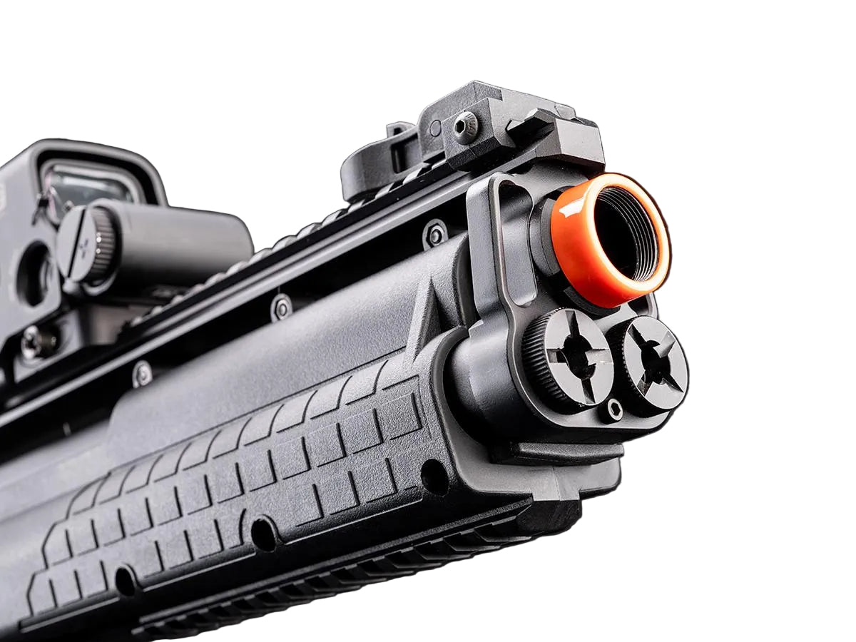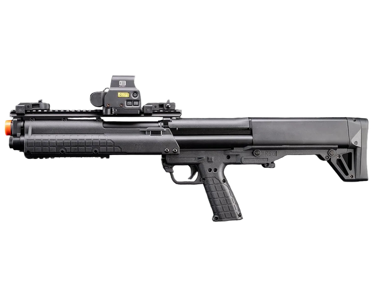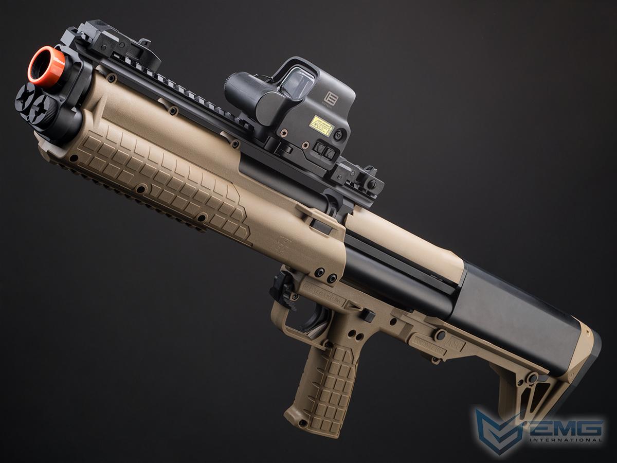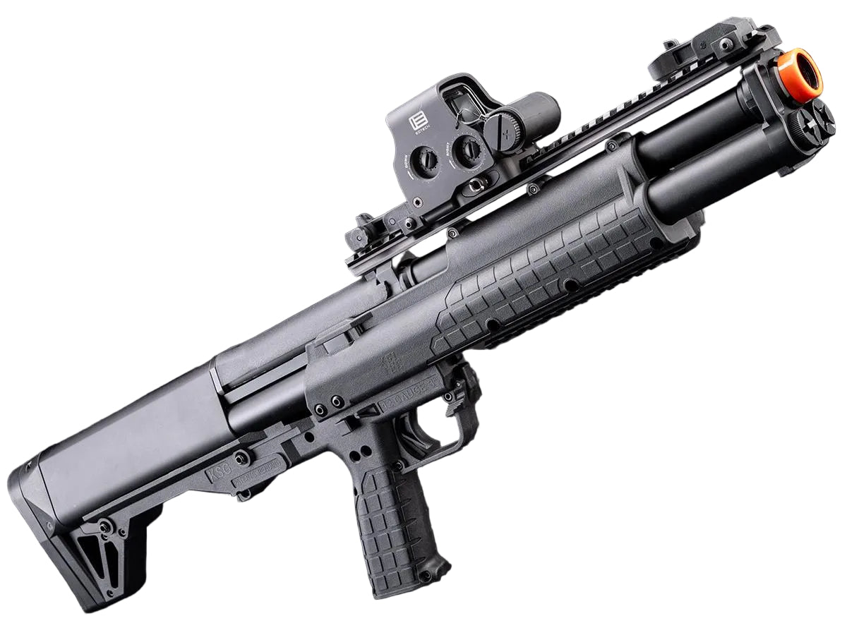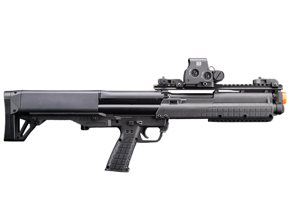 EMG has faithfully recreated a durable, reliable and cost efficient gas powered KSG bullpup Airsoft replica. Powered by a removable reservoir filled with green gas, this shotgun is capable of firing between 3 and 6 BB's at one time by manipulating a switch underneath a dust cover right behind the rear sight. The KSG has 3 inner barrels and is equipped with a fixed hop-up for each barrel. The shotgun accepts aftermarket 30 round Airsoft shotgun shells and magazine adapters. Picatinny rail segments are located on the top and bottom of the gun that allows mounting foregrips, laser designators, flash lights, scopes and more. Flip-up iron sights are included and are located on the top rail. Overall this compact bullpup shotgun would be a great addition to your Airsoft arsenal.