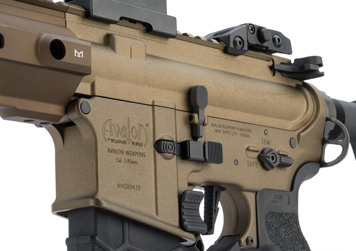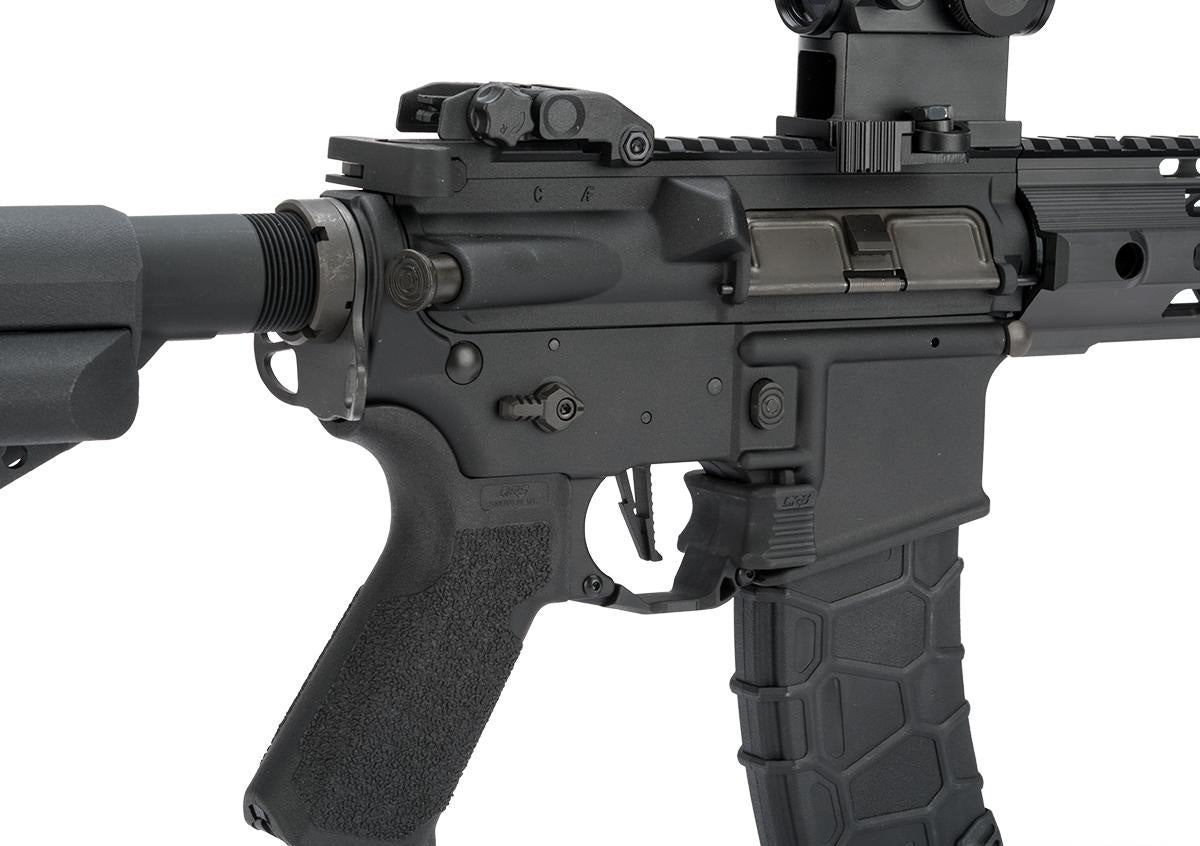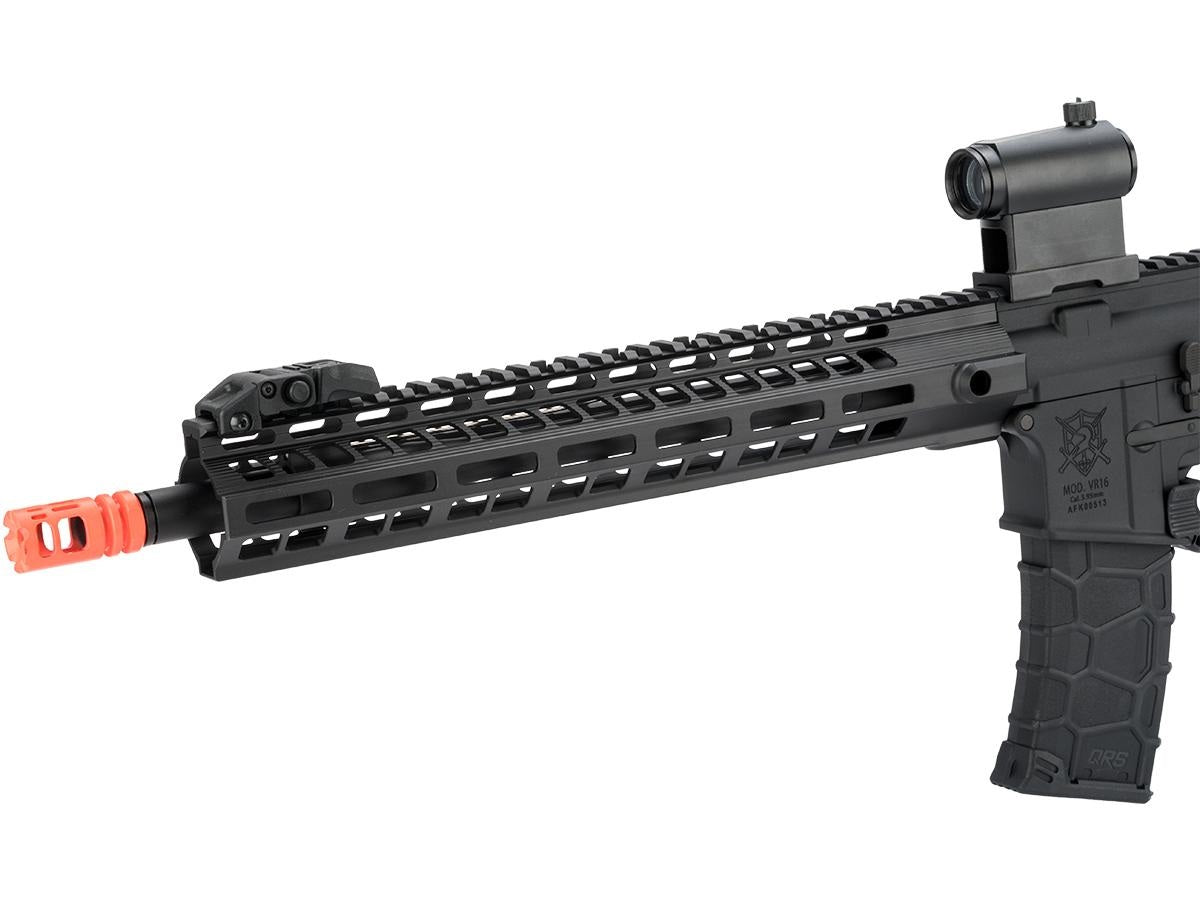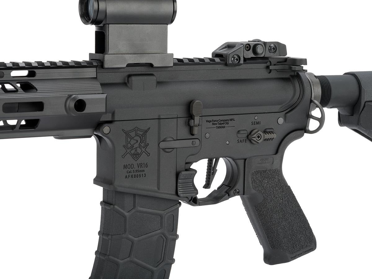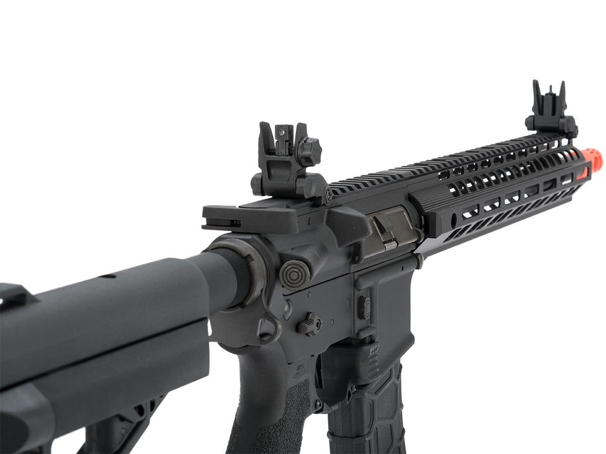 Dressed to impress, the Elite Force VFC AVALON SABER Carbine is outfitted for black-tie quality airsoft performance. The 14.5 inch barrel is shrouded by a full length M-LOK hand guard topped with full length Picatinny rail and a flip-up adjustable front sight. Moving back to the receiver, a matching adjustable flip-up rear sight is mounted in the slots in front of the charging handle. The stock is an adjustable QRS unit equipped with QD sockets and a top Sling strap while the grip is a matching QRS handle with an aggressive yet comfortable texture. The real good bits are under the skin of the VFC SABER Carbine Airsoft Rifle. With a smart VFC Version 2 MOSFET you can run 7.4 to 11.1v batteries. The full metal motor and gearbox are the ticket for long lasting high performance. This sweet AEG is also equipped with an ambidextrous selector switch and magazine release.