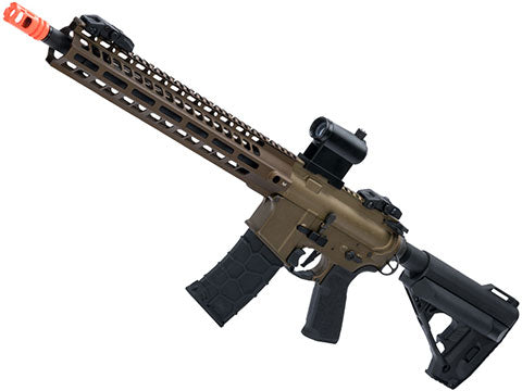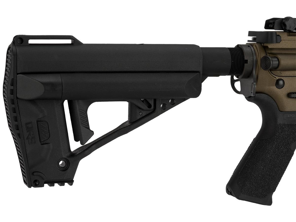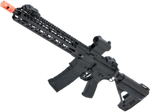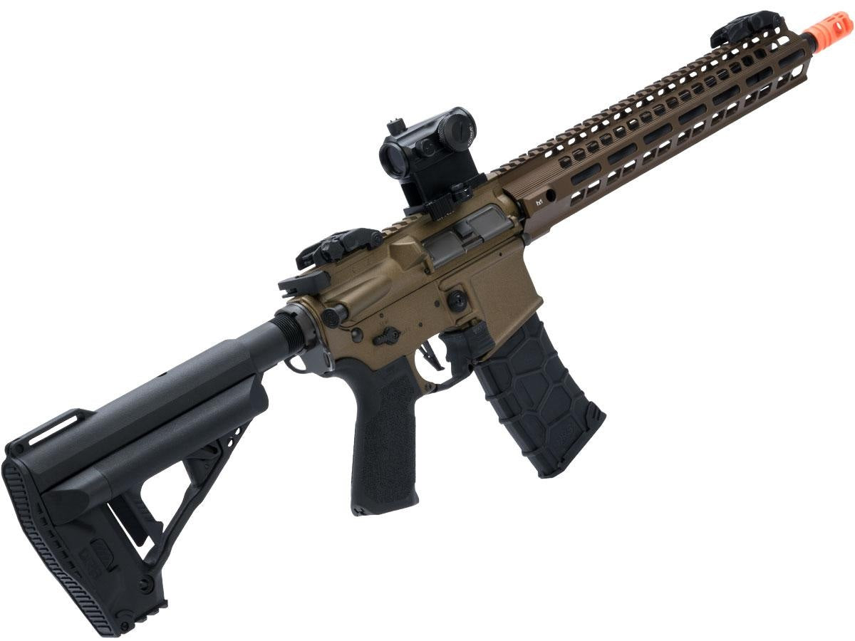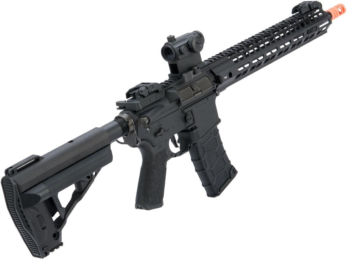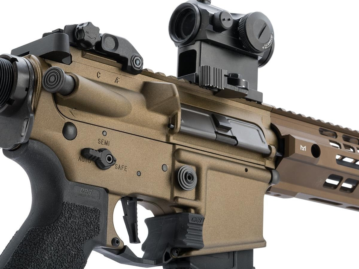 Dressed to impress, the Elite Force VFC AVALON SABER Carbine is outfitted for black-tie quality airsoft performance. The 14.5 inch barrel is shrouded by a full length M-LOK hand guard topped with full length Picatinny rail and a flip-up adjustable front sight. Moving back to the receiver, a matching adjustable flip-up rear sight is mounted in the slots in front of the charging handle. The stock is an adjustable QRS unit equipped with QD sockets and a top Sling strap while the grip is a matching QRS handle with an aggressive yet comfortable texture. The real good bits are under the skin of the VFC SABER Carbine Airsoft Rifle. With a smart VFC Version 2 MOSFET you can run 7.4 to 11.1v batteries. The full metal motor and gearbox are the ticket for long lasting high performance. This sweet AEG is also equipped with an ambidextrous selector switch and magazine release.