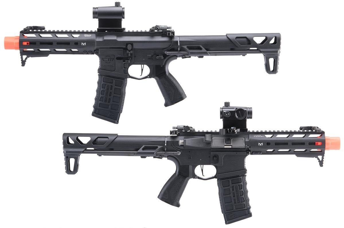 Length: 600mm - 660mm (adjustable) Weight (w/ Magazine): 2240g Inner Barrel: Approx. 180mm Magazine Capacity: 300 rounds. G&G and other compatible M4 series AEG magazines Thread Direction: 14mm Negative Gearbox: Ver 2 Full Metal w/ 8mm Bushings, Fully Upgradeable Motor: Long Type Fire Modes: Semi/Full-Auto, Safety Muzzle Velocity: ~1.49 Joules (Tested w/ 0.20g BBs) Battery: 7.4V Small Type recommended (Battery not included. Wired to buffer tube with small Tamiya connector) Hopup: Yes, Adjustable Package Includes: Gun, Magazine, Manual
