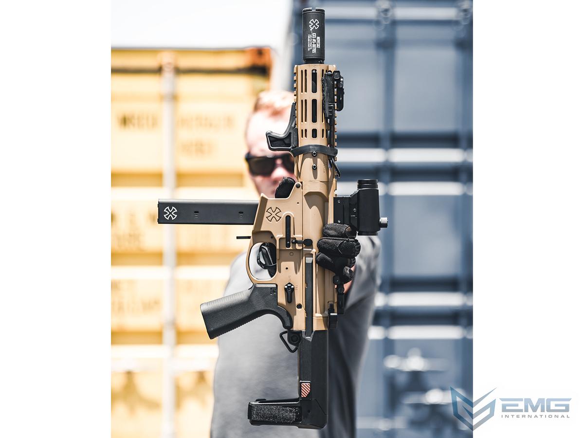True of any EMG collaboration, we worked very closely with Novekse upon the inception of creating the Space Invader AEG. This rifle was not just inspired by the original, but is almost a complete carbon copy replica of the real thing when it comes to looks. The EMG Space Invader AEG is adorned with authentic, licensed Noveske trademarks along with accurate 1:1 details throughout the rifle. An EMG Alpha pistol grip is fitted to the receiver for improved ergonomics and control, and a pistol-brace style collapsible stock sits at the back for weight reduction, improving overall weapon handling. Like the real thing, the EMG Space Invader includes an 8.3" rail handguard that includes 20mm Picatinny sections on the top and bottom along with M-LOK segments on the sides, giving you plenty of options for accessories to use and where to put them. The top of the rifle features 20mm Picatinny rail space along the length of the gun, and is topped off with low-profile flip-up front and rear sights.