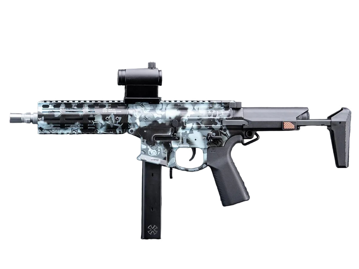 True of any EMG collaboration, we worked very closely with Novekse upon the inception of creating the Space Invader AEG. This rifle was not just inspired by the original, but is almost a complete carbon copy replica of the real thing when it comes to looks. The EMG Space Invader AEG is adorned with authentic, licensed Noveske trademarks along with accurate 1:1 details throughout the rifle. An EMG Alpha pistol grip is fitted to the receiver for improved ergonomics and control, and a pistol-brace style collapsible stock sits at the back for weight reduction, improving overall weapon handling. Like the real thing, the EMG Space Invader includes an 8.3" rail handguard that includes 20mm Picatinny sections on the top and bottom along with M-LOK segments on the sides, giving you plenty of options for accessories to use and where to put them. The top of the rifle features 20mm Picatinny rail space along the length of the gun, and is topped off with low-profile flip-up front and rear sights.
