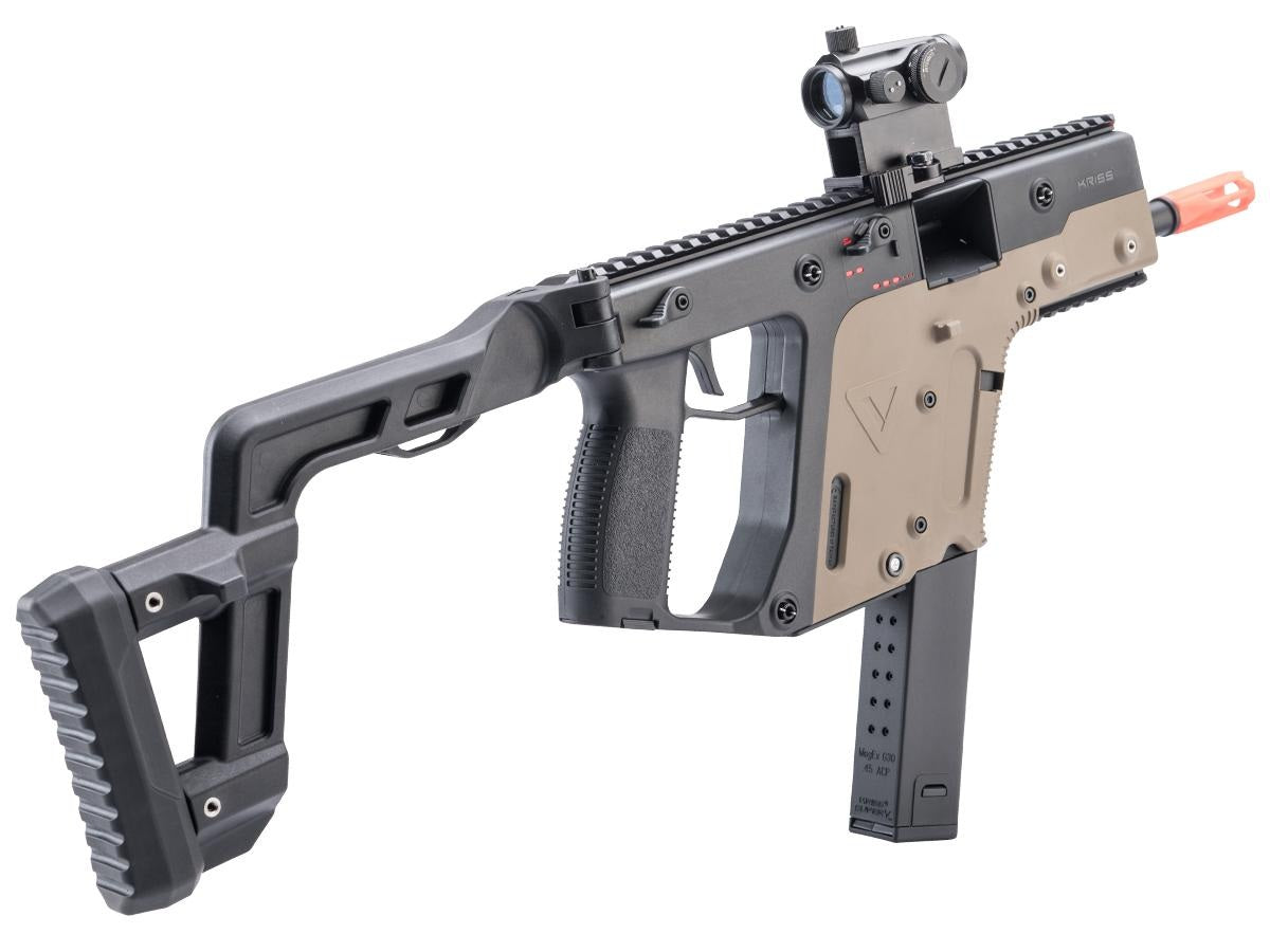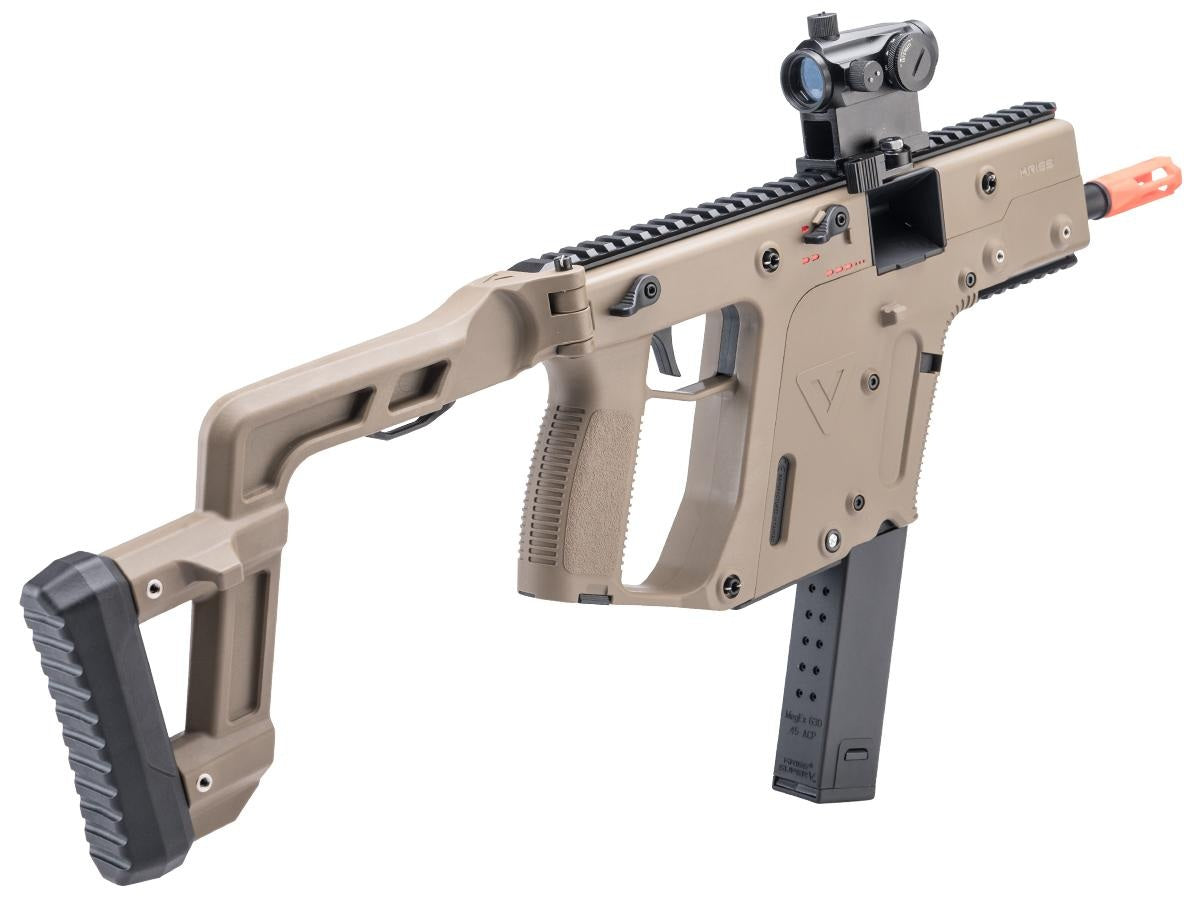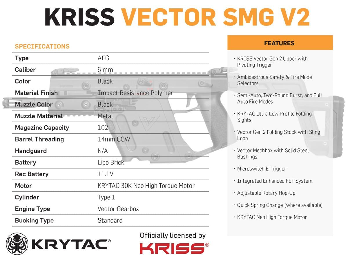 The KRYTAC Vector AEG has been upgraded with new internal enhancements for improved performance. The Vector SMG V2 features a specialized mechbox with solid steel bushings, a ported full metal rack piston and an integrated enhanced FET system providing active braking, low battery detection and gear strip protection. It also includes a micro switch E-trigger and an updated neo high-torque motor for fast, consistent responses. These updates make the KRYTAC Vector AEG a top choice for players seeking reliability, versatility and advanced technology in Airsoft.