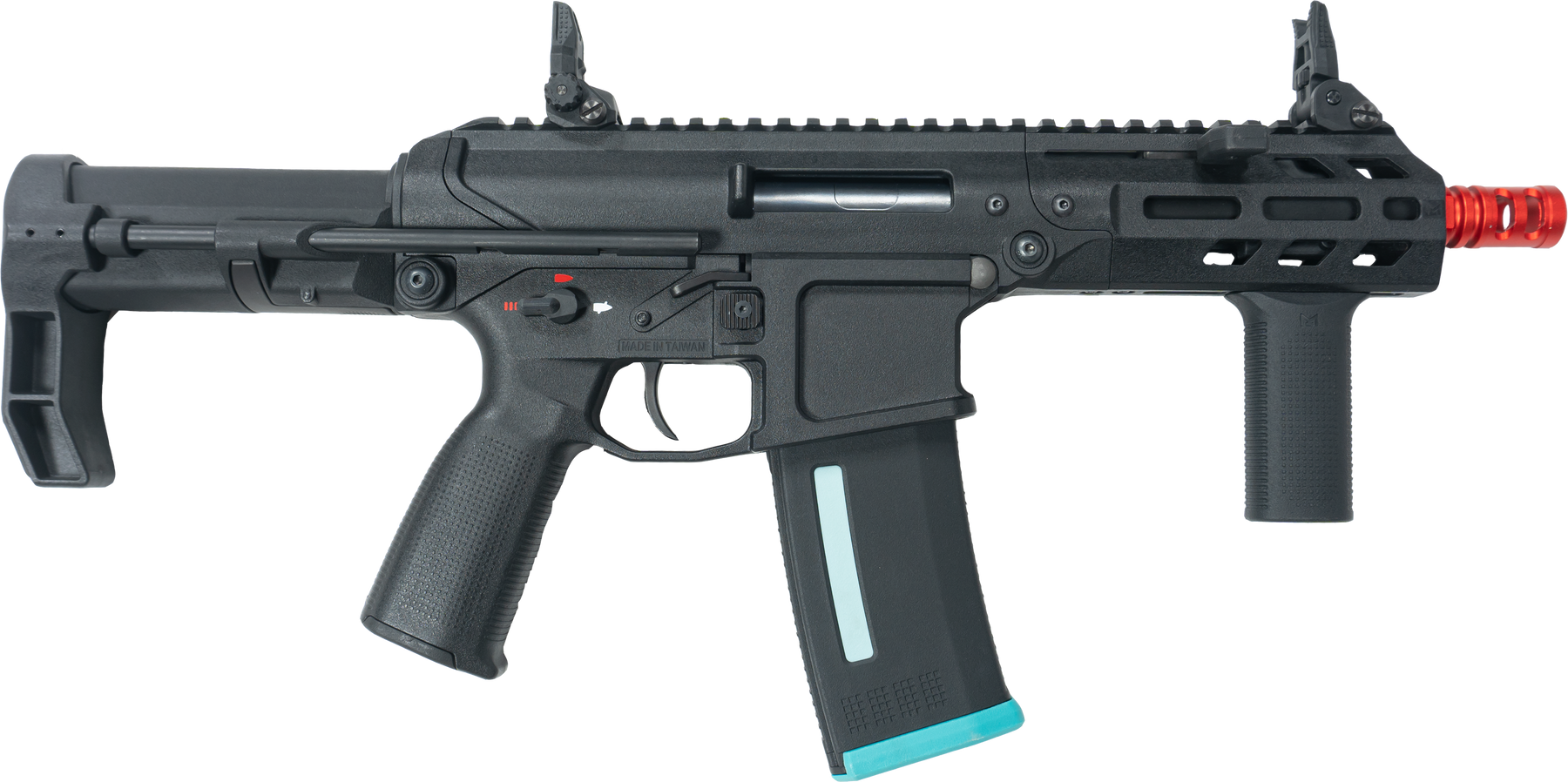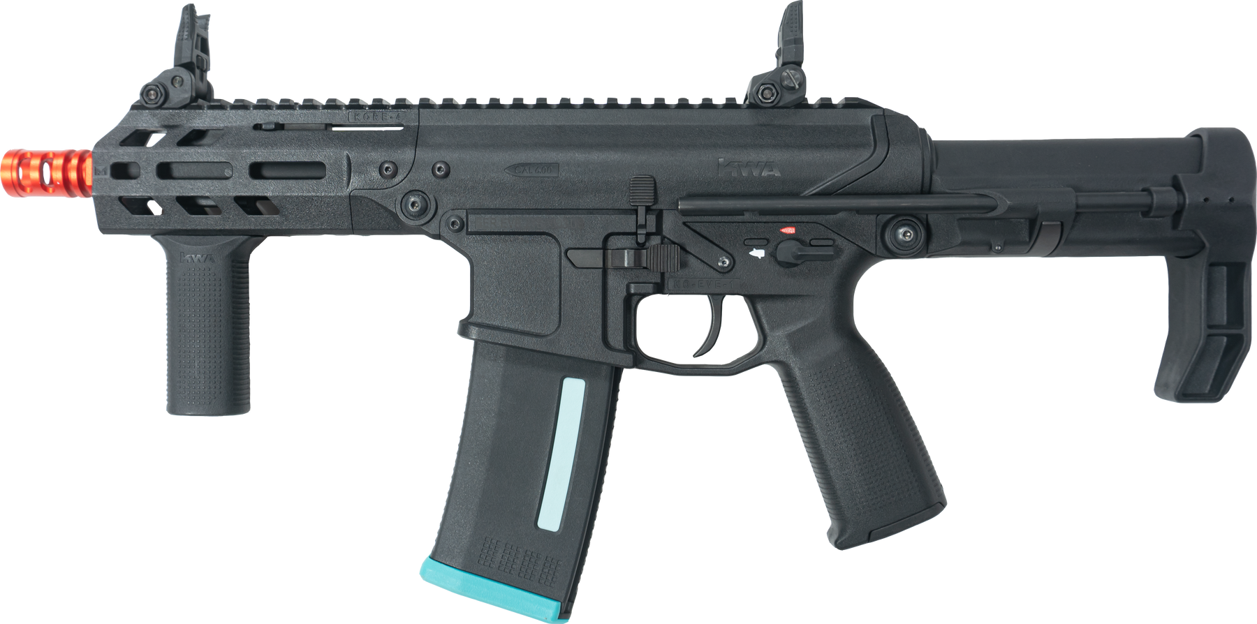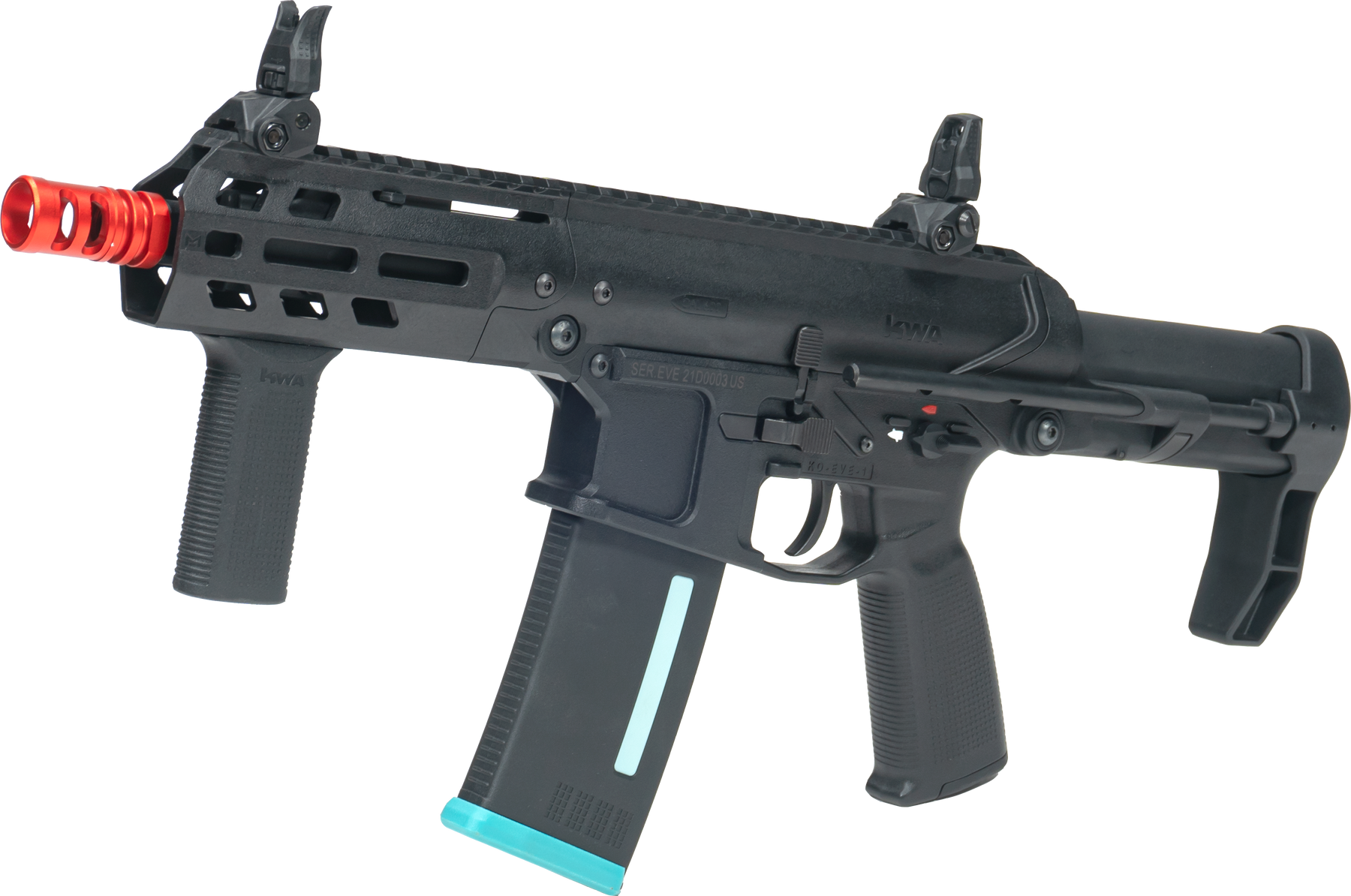 The side charging handle allows for convenient hop up adjustment and the integrated pistol grip is optimized for maximum ergonomics. The KO:EVE-4 comes with KO’s new slim line vertical grip and maintains it’s compact footprint using KWA’s tried and true PDW stock. PTS Enhance Polymer Sights, two port muzzle brake, ambi fire controls, and optional quick detach sockets front and rear round out the external package. Internally, the KO:EVE-4 shares the same 2.5+ VPS gearbox as the TK.45c, Ronin T6, QRF Mod Series, Ronin 47. Install your favorite aftermarket electronic trigger group, and you have an ultra-responsive and lightweight polymer AEG with legendary KWA performance.