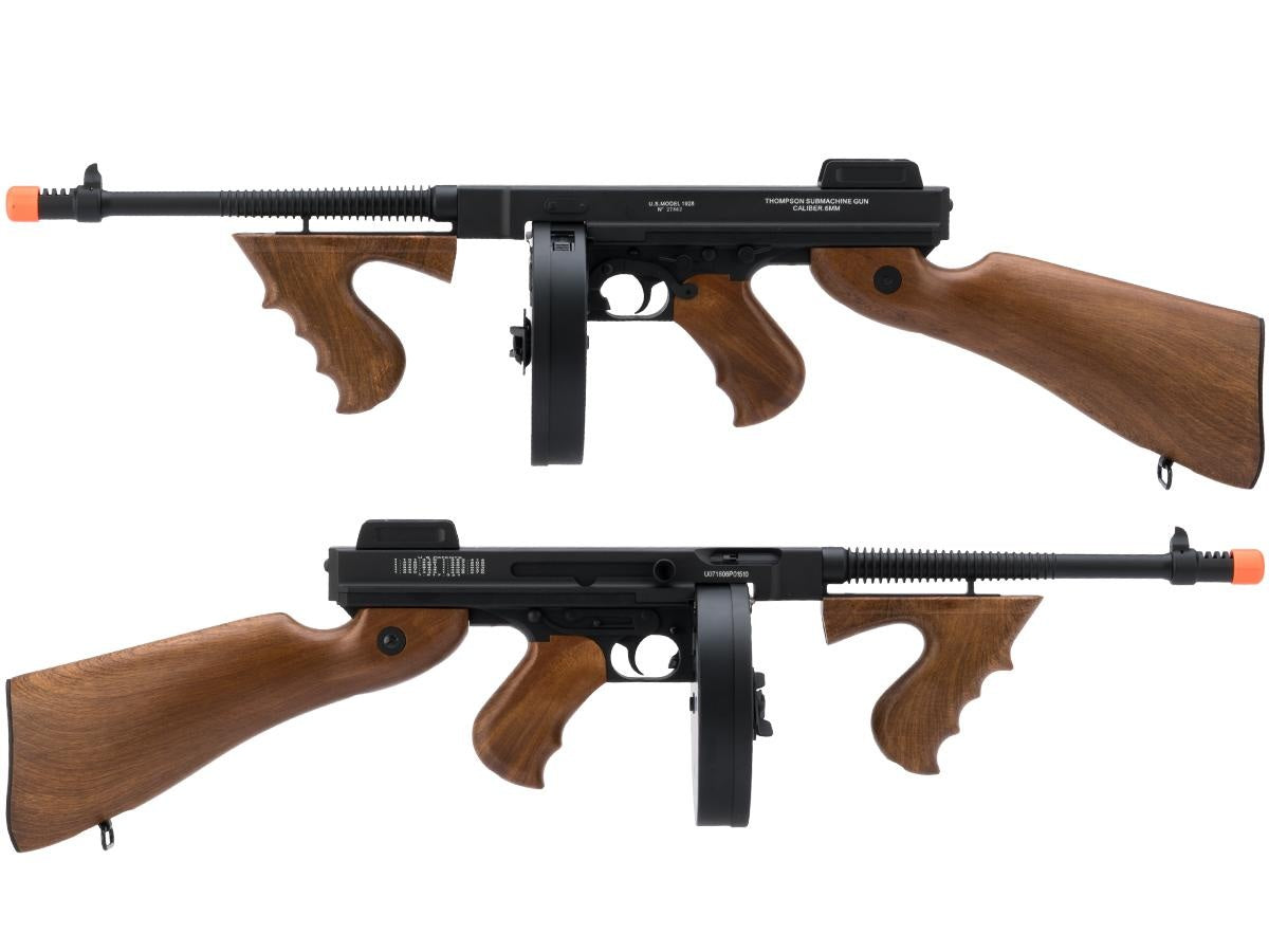 The infamous Thompson Model 1928 aka the "Tommy Gun" or "Chicago Typewriter" was favored by every mobster and gangster in the early 1900s for its firepower and portability. Even the infamous John Dillinger, Public Enemy Number One, favored the Thompson submachine gun. Johnny Depp, who plays Dillinger in the Hollywood movie "Public Enemies" wields the Tommy gun in several intense fight scenes. This replica is true to the original and comes complete with foregrip, finned barrel and signature Cutts Compensator.