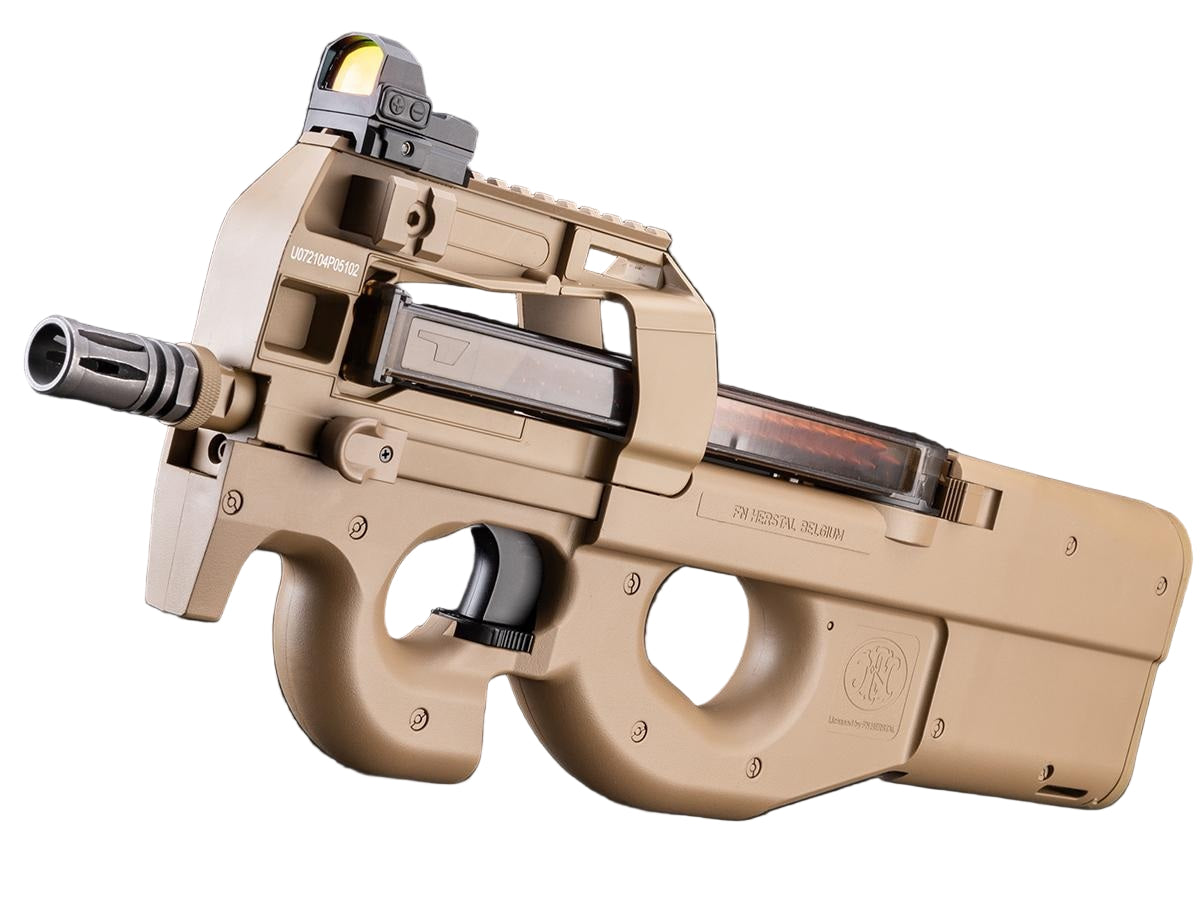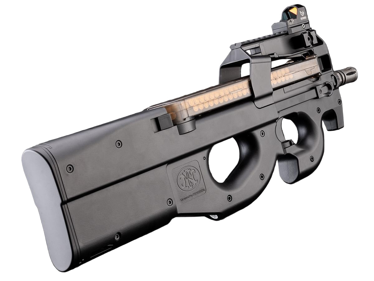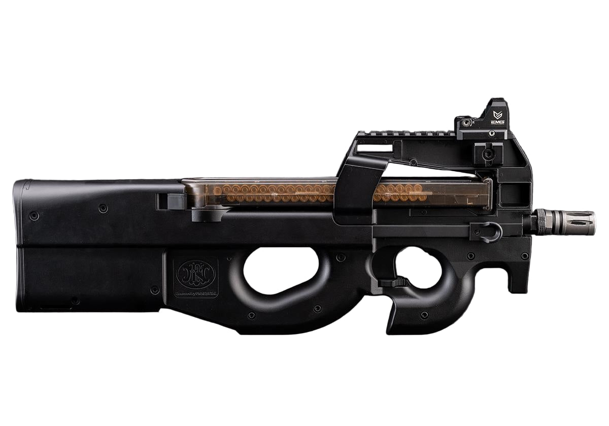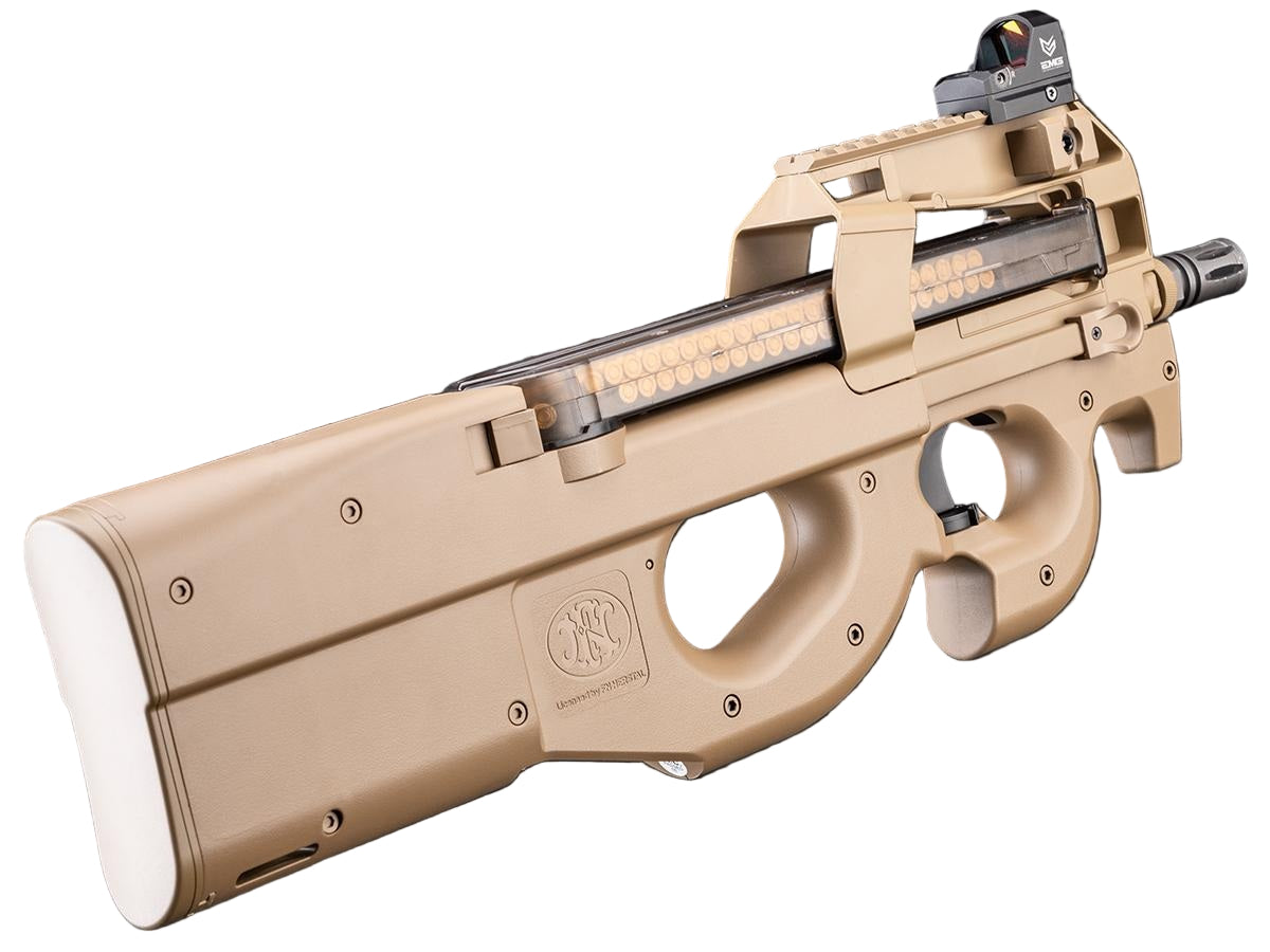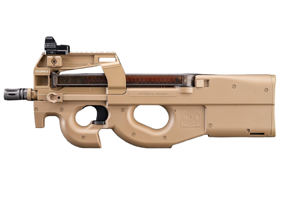 Developed in response to NATO requests for a compact but effective firearm for vehicle crews, support personnel, special operations, counter-terrorist units, and crew served weapon operators, the FN-P90 manages to excel in many of the categories FN-Herstal set out to achieve. The futuristic Personal Defense Weapon (PDW) / Sub-Machine Gun (SMG) entered production in 1990 and began service starting in 1991 and is continued to be used by militaries, law enforcement, and special operation groups around the world today. Chambered in the 5.7x28mm cartridge, the weapon far surpassed the 9x19mm weapons in performance and handling. The small caliber boasted greatly improved velocity at only half the weight of standard 9x19mm cartridges thus allowing the user to carry a great deal more ammunition into combat. Additionally, more rounds can be loaded into a magazine thanks to the cartridges relatively small diameter. Due to its incredibly high velocity, the 5.7x28mm cartridge fires at an exceptionally flat trajectory with roughly 30% less felt recoil which greatly improves accuracy even under fully automatic fire. The FN-P90s design came about after extensive ergonomic research; its small profile makes it ideal for tight, confined spaces as well as for personnel who require a concealable weapon. Featuring true-fully-ambidextrous controls, the FN-P90 is the first of its kind to be right handed and left handed shooter friendly without any modification or re-configuring of the firearm. The weapons charging handle, magazine release, and back up sights are symmetrically distributed on both sides of the firearm; the safety / fire control is located at the base of the firearms trigger which can be easily accessed with the thumb or index finger. The weapon also uniquely ejects spent casings downwards away from the users face which makes for a much more pleasant shooting experience when needing to transition from left to right and vice versa.