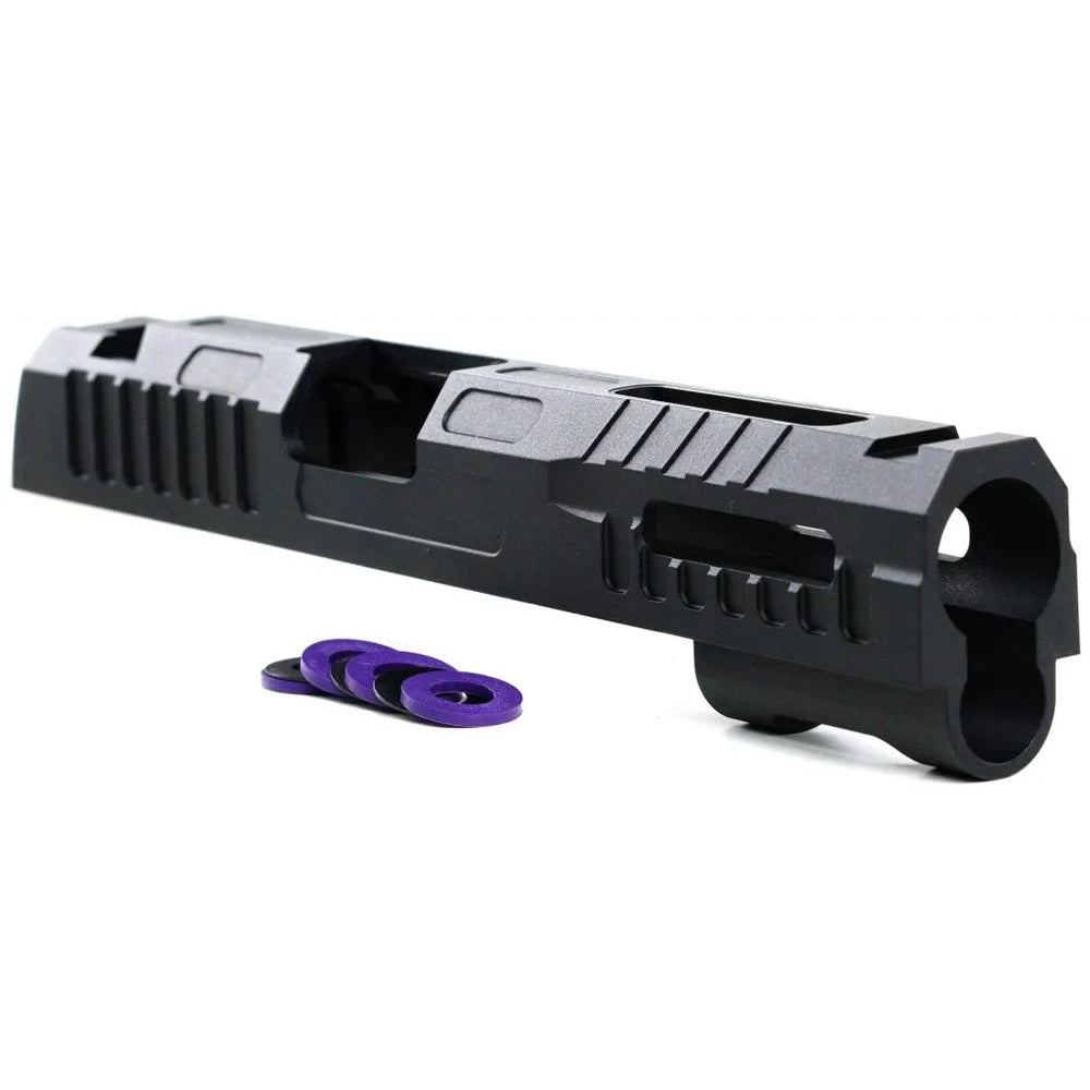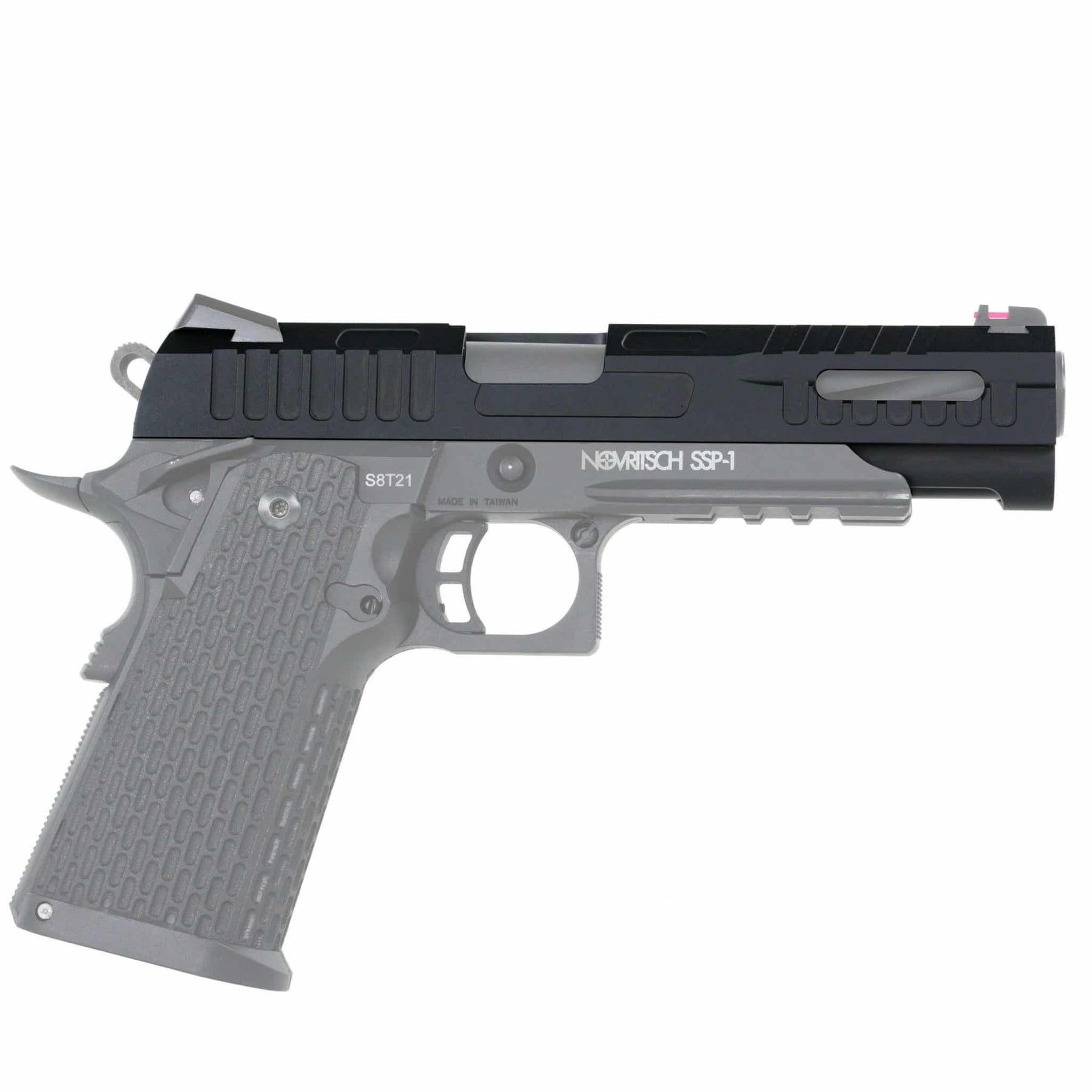 Lightweight aluminum slide for the NOVRITSCH SSP-1 with cutouts and short stroke kit. It locks back with the last shot, even with the short stroke kit installed, which makes it unique among the existing hi-capa tuning slides. The machined serrations on the slide improve the grip, make racking the slide easier and decrease the overall weight by 14%. Less mass has to be moved back and forth which makes the gun cycle faster than standard pistol slides resulting in an overall better shooting experience.